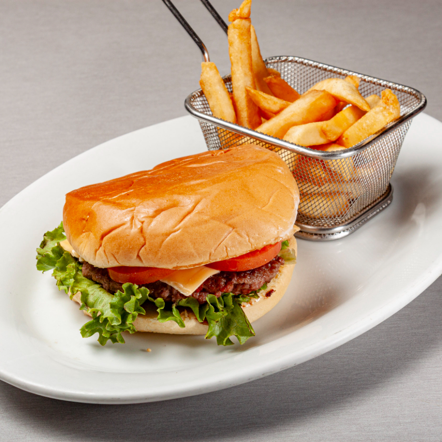 Hamburguesa con queso amarillo,lechuga y jitomate Acompañado con papas.