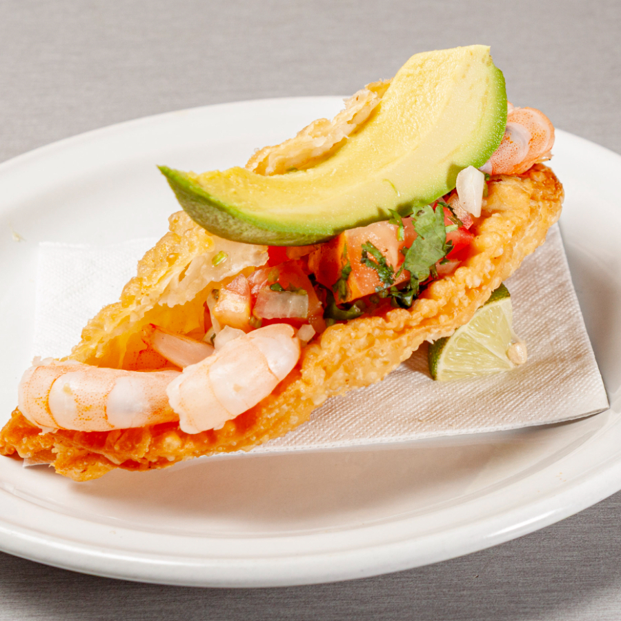 1pz 40gr Quesadilla frita rellena de camarón pacotilla,queso manchego,pico de gallo y aguacate