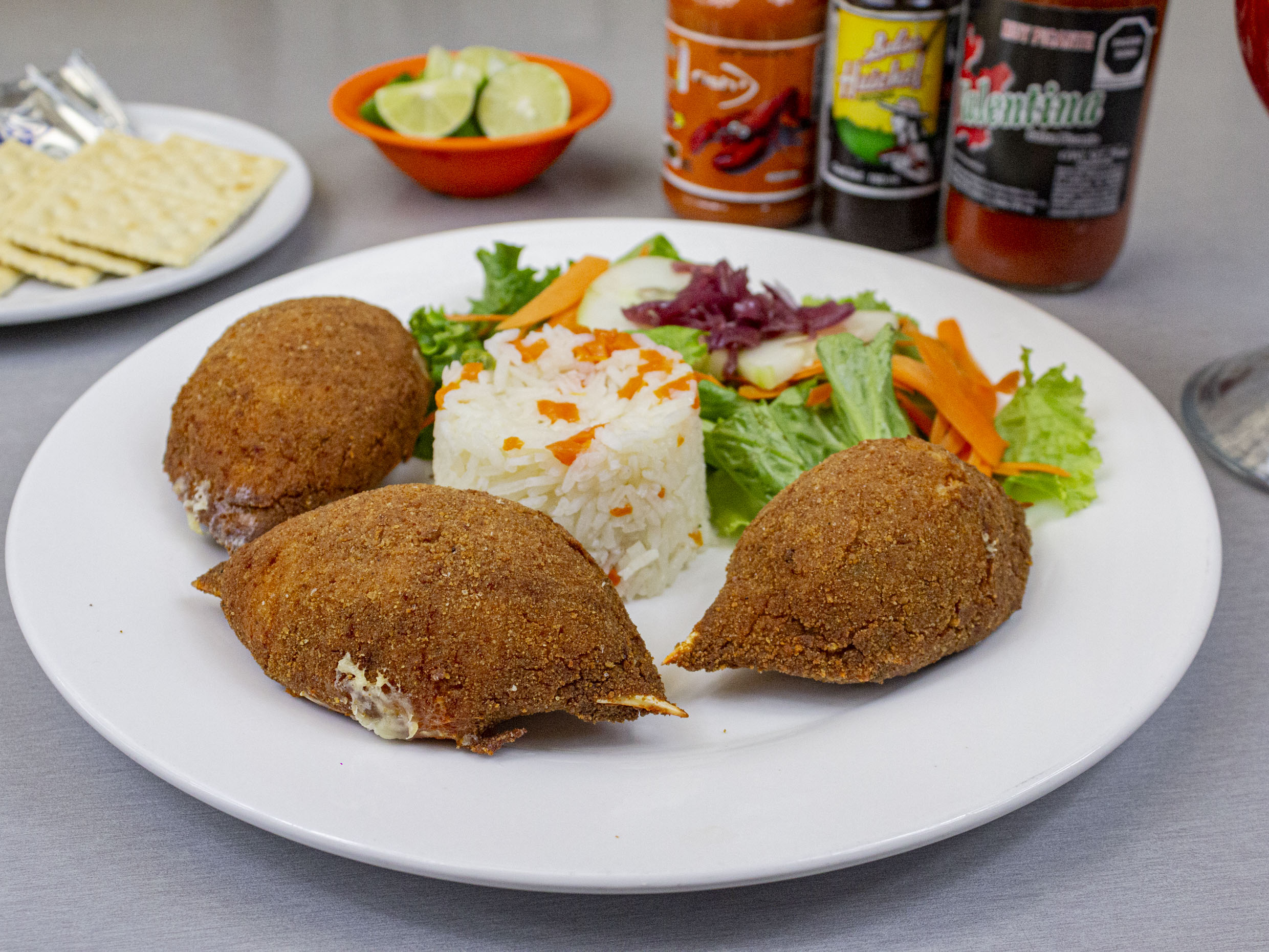 2pz rellena de jaiba guisada,queso manchego y empanizadas acompañada de arroz y ensalada.