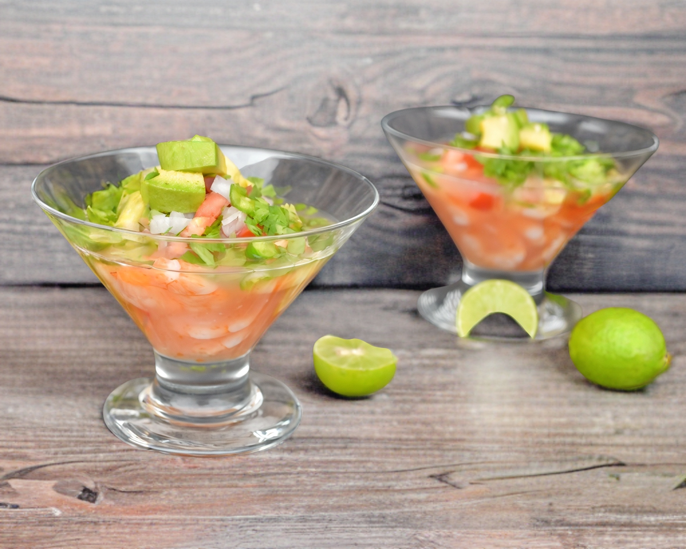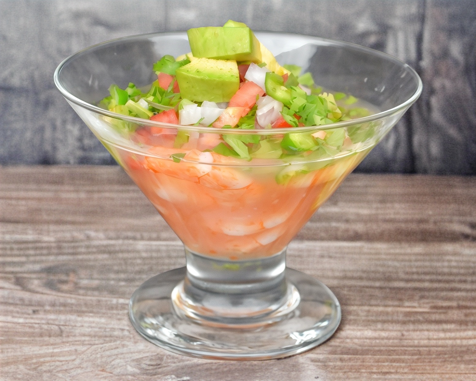 Coctel de camarón con salsa de la casa, cilantro, cebolla y aguacate.