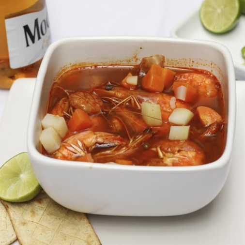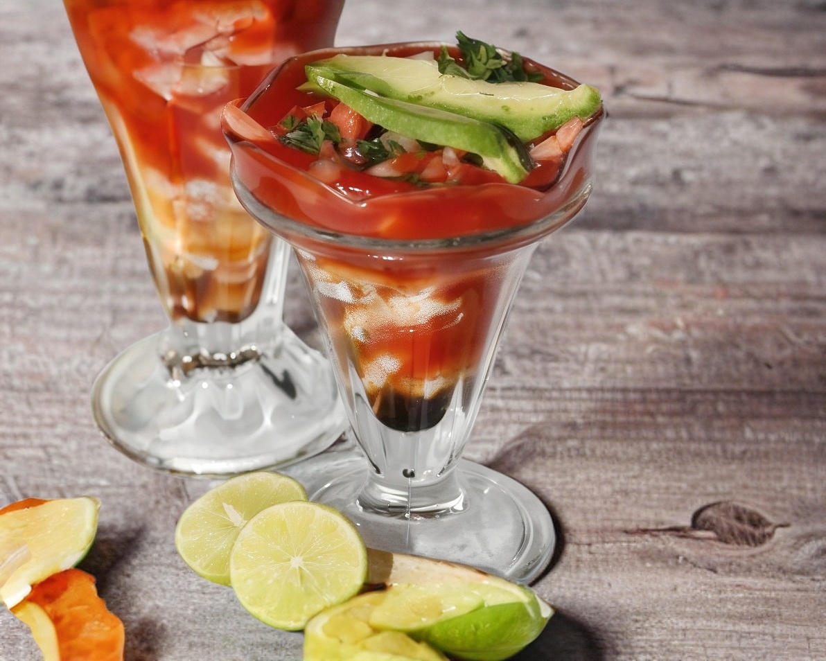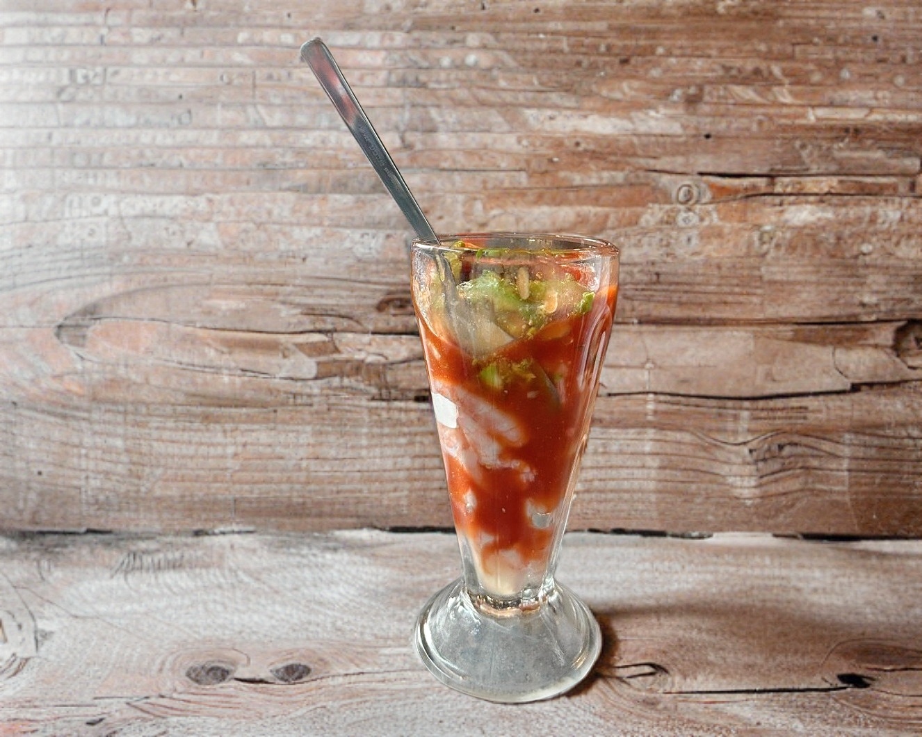 Coctel con camarón, pulpo, pepino, cilantro, cebolla y aguacate.