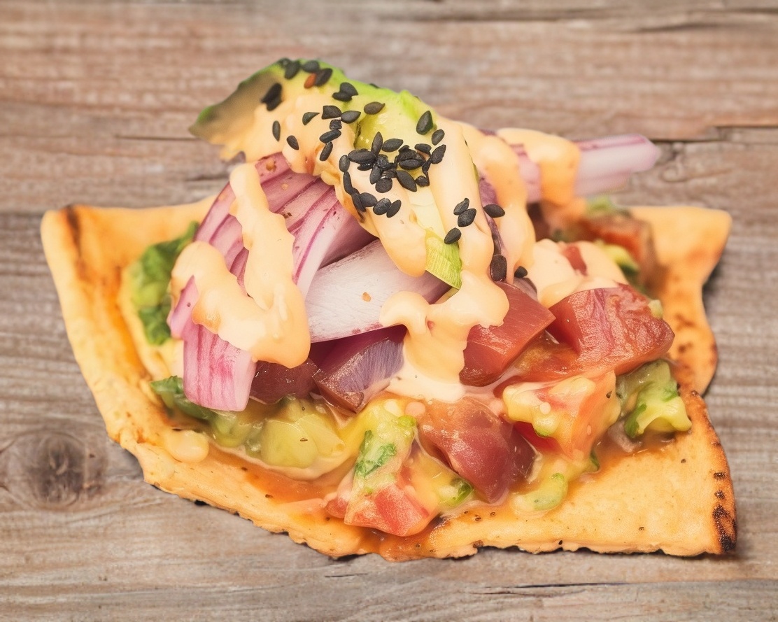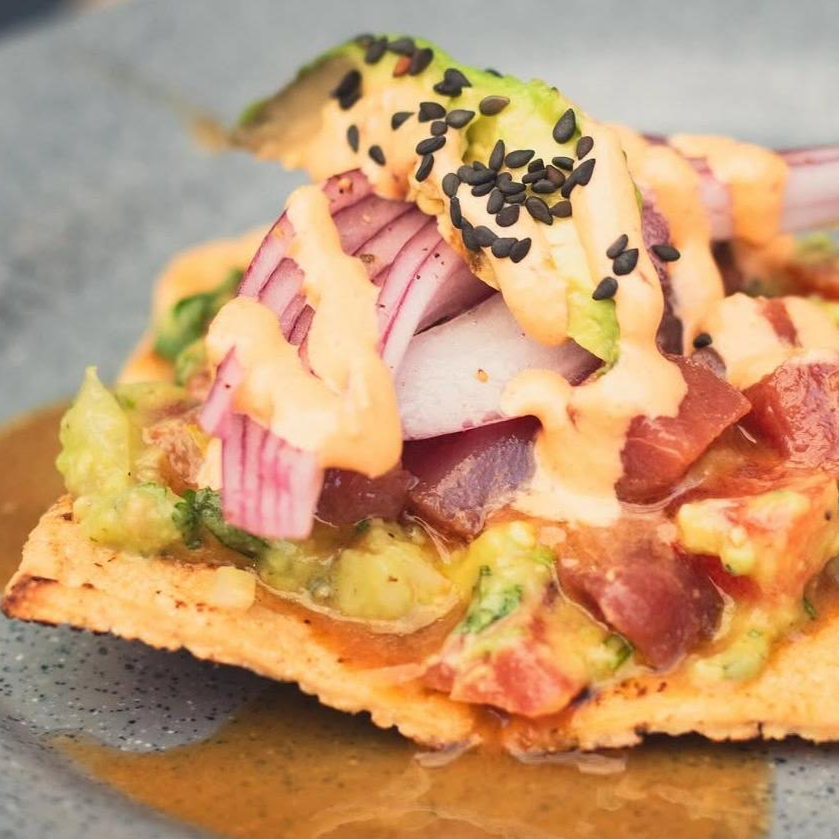 Tostada de maíz con atún en cubitos con salsa pozu y aderezo de chipotle bañados con ajonjoli negro, y cebolla morada