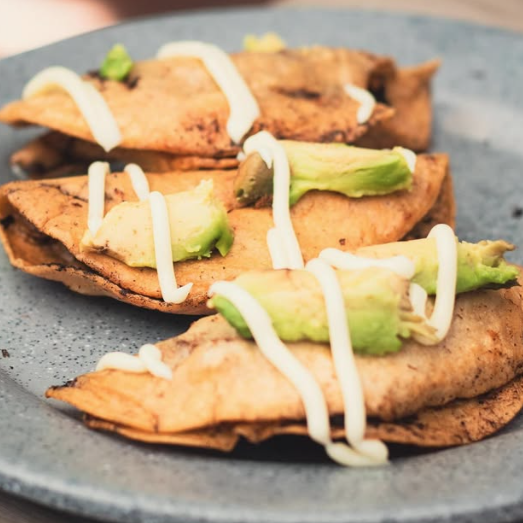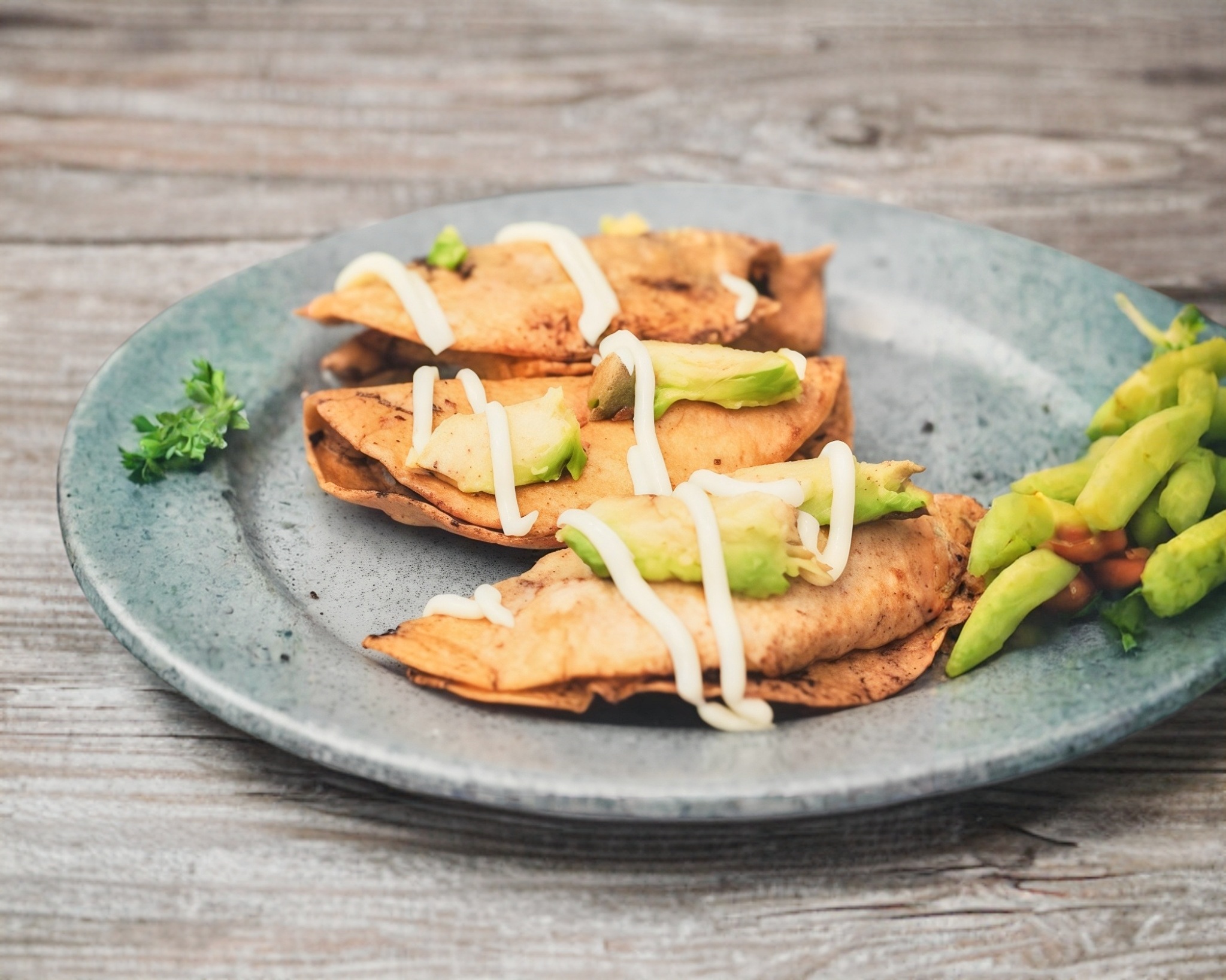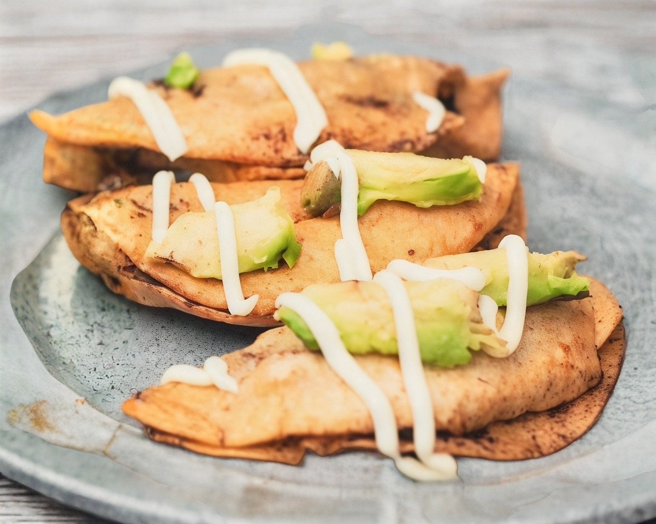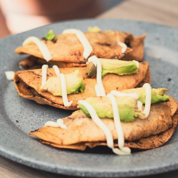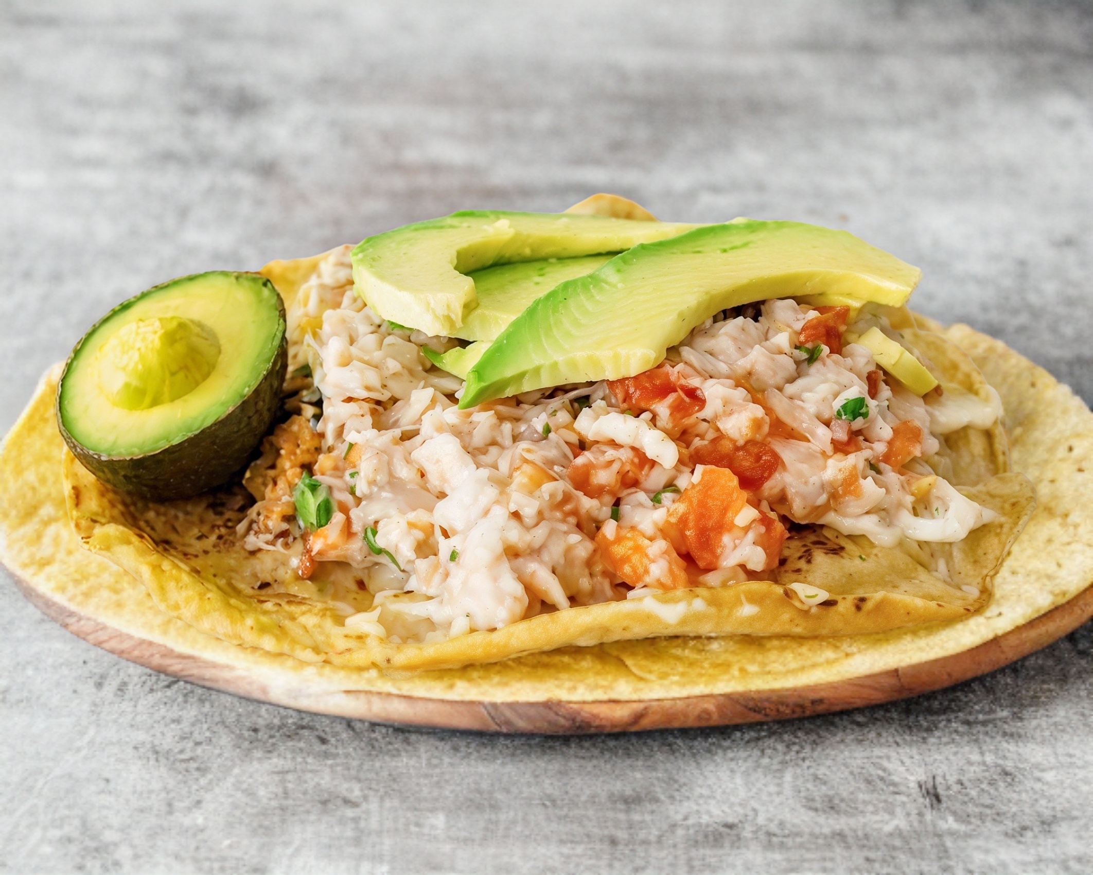 Tortilla de maíz con camarón, queso y aderezo de la casa.