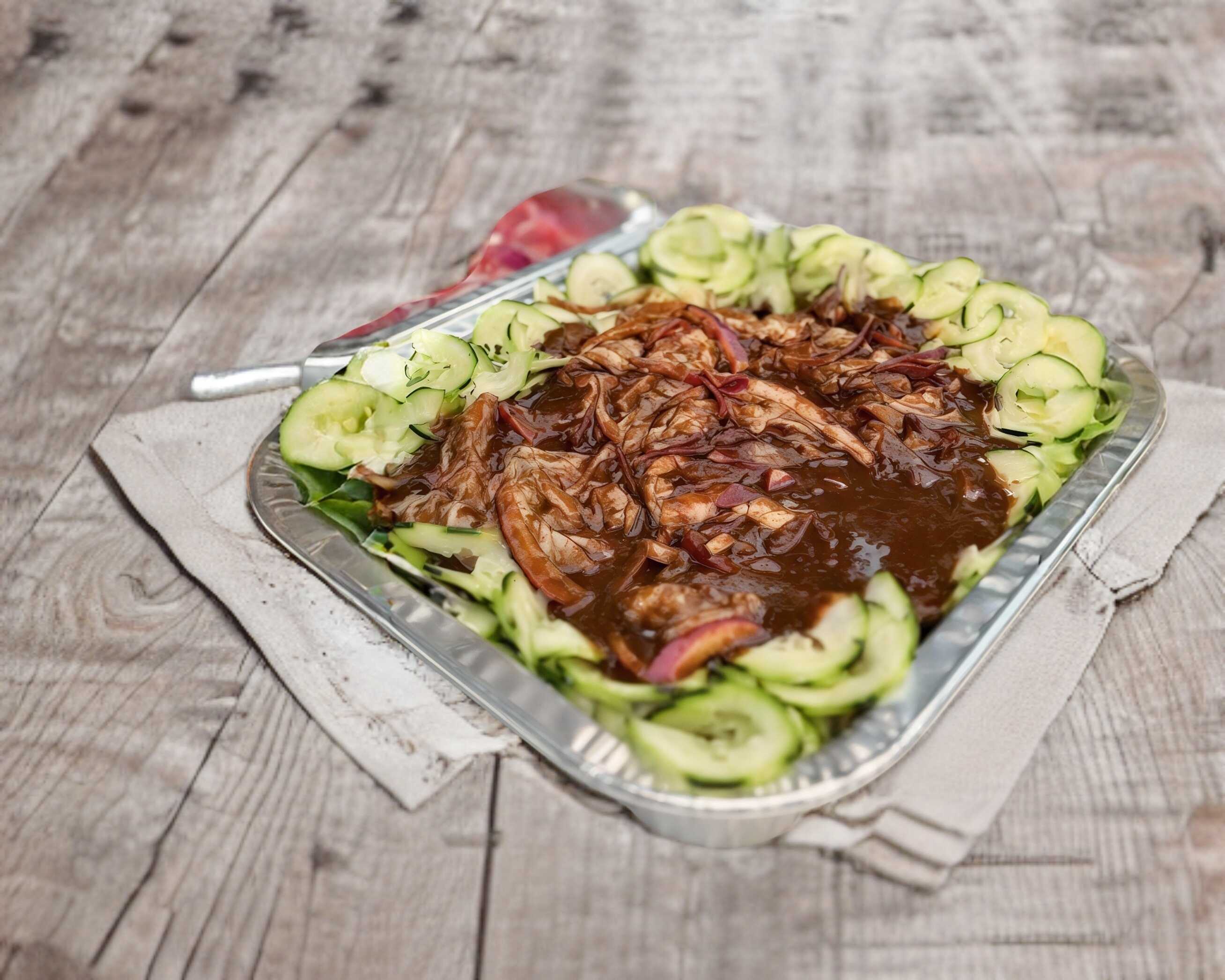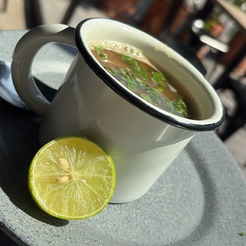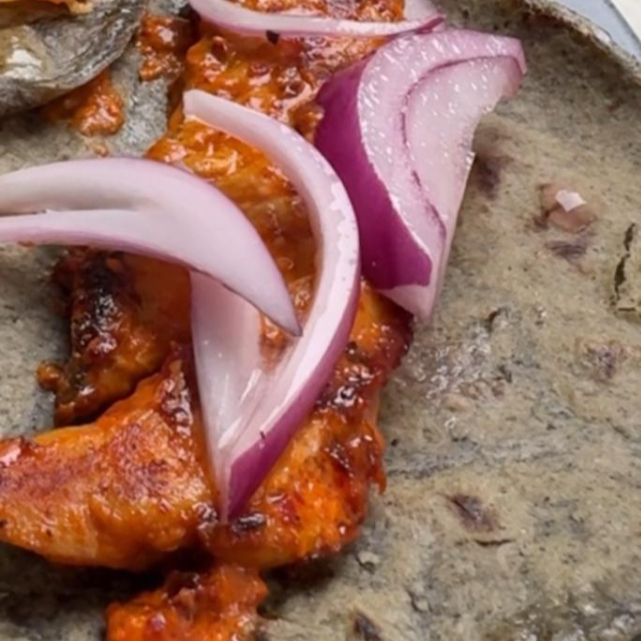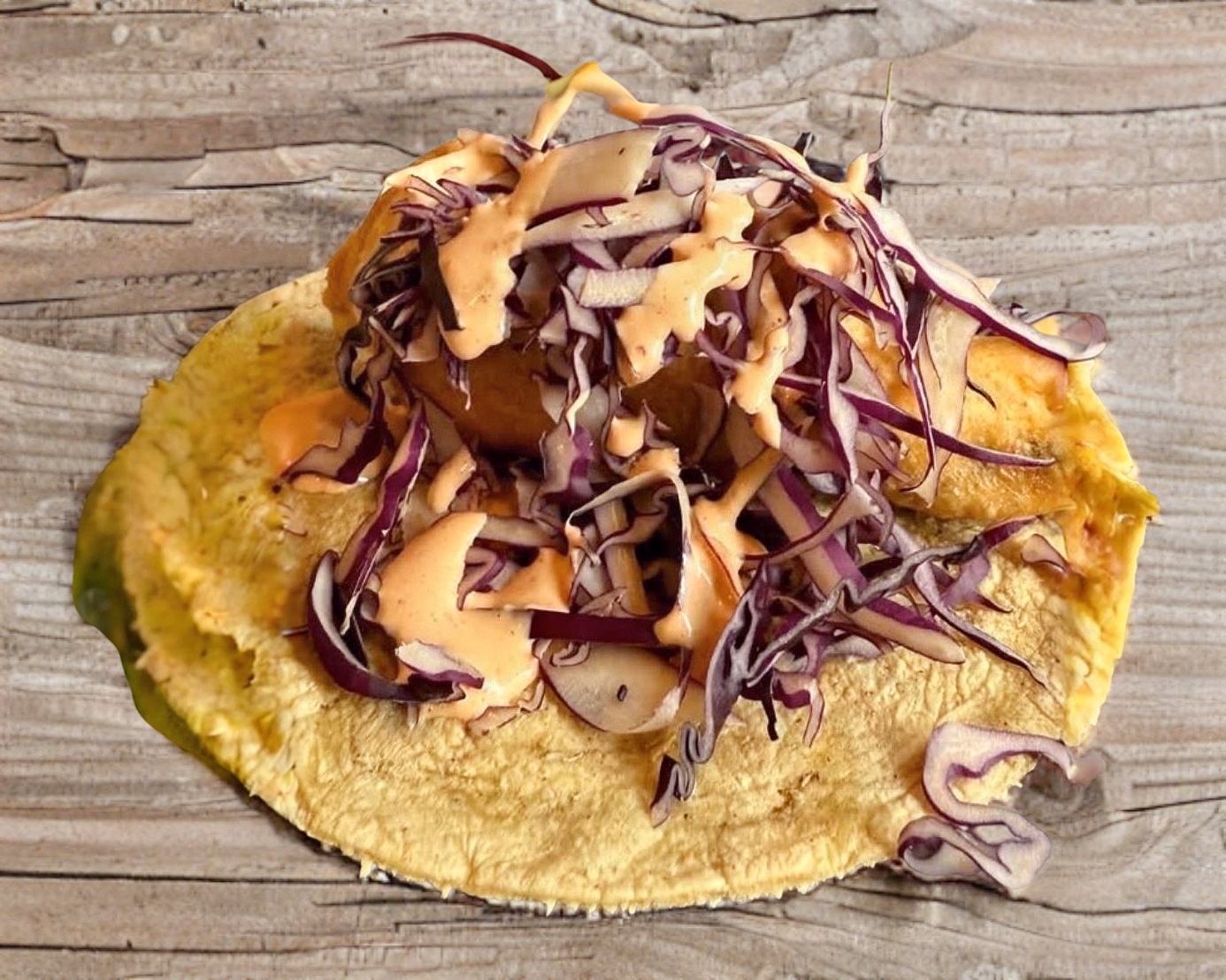 Tortilla de maíz, cebolla encurtida, col y aderezo de la casa.