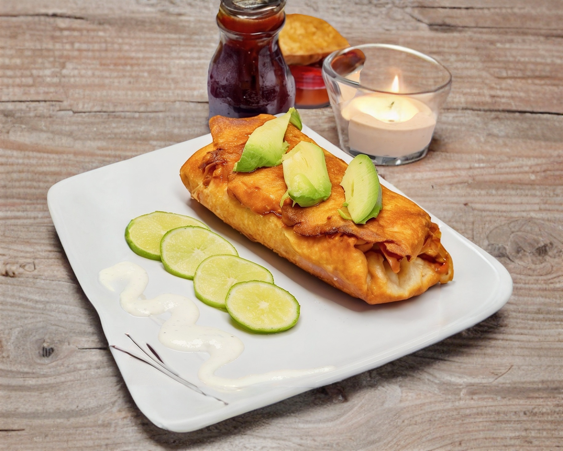 Burrito en tortilla de harina con camarón guisado, pulpo y queso gouda.