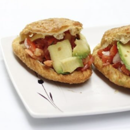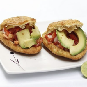 Empanada de camarón frita con pico de gallo y aderezo de la casa.