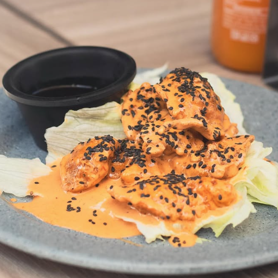 Camarones capeados con una mezcla de aderezos mexicanos y orientales y ajonjolí negro