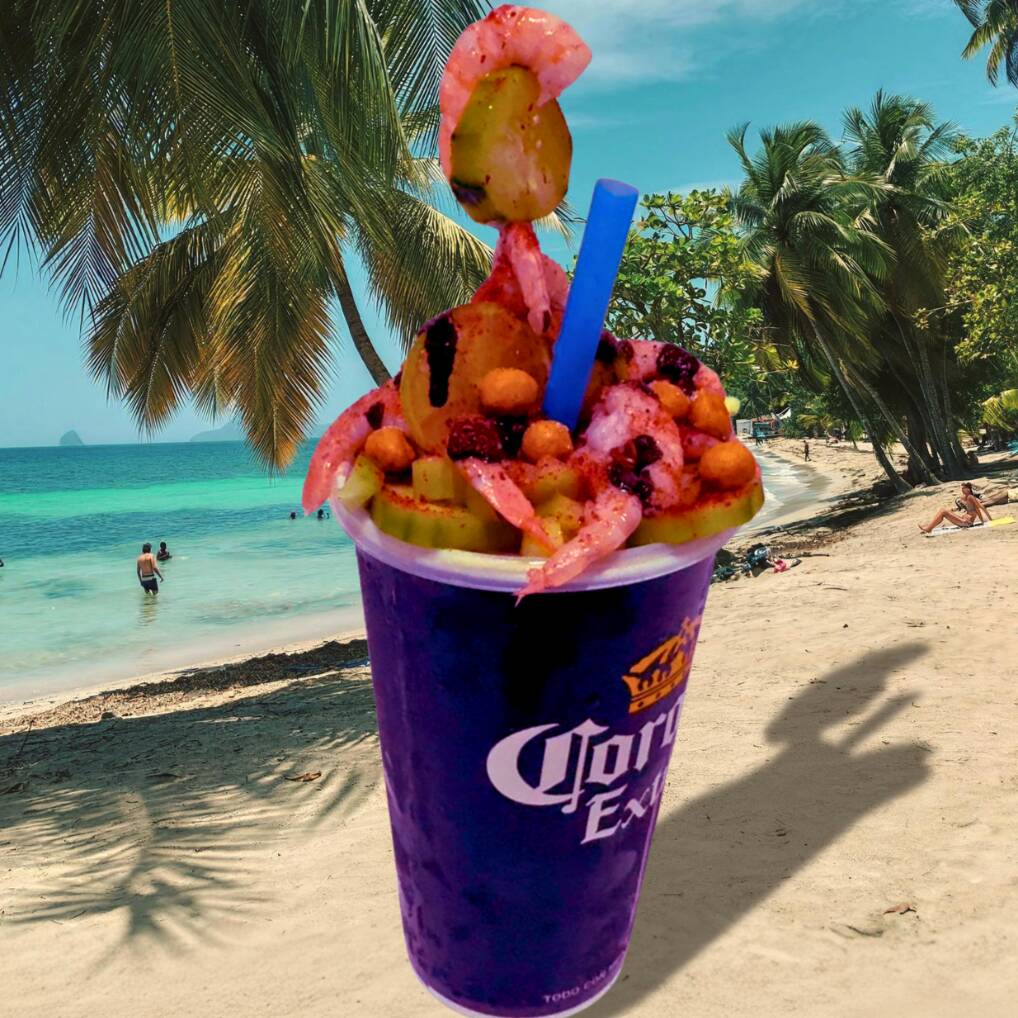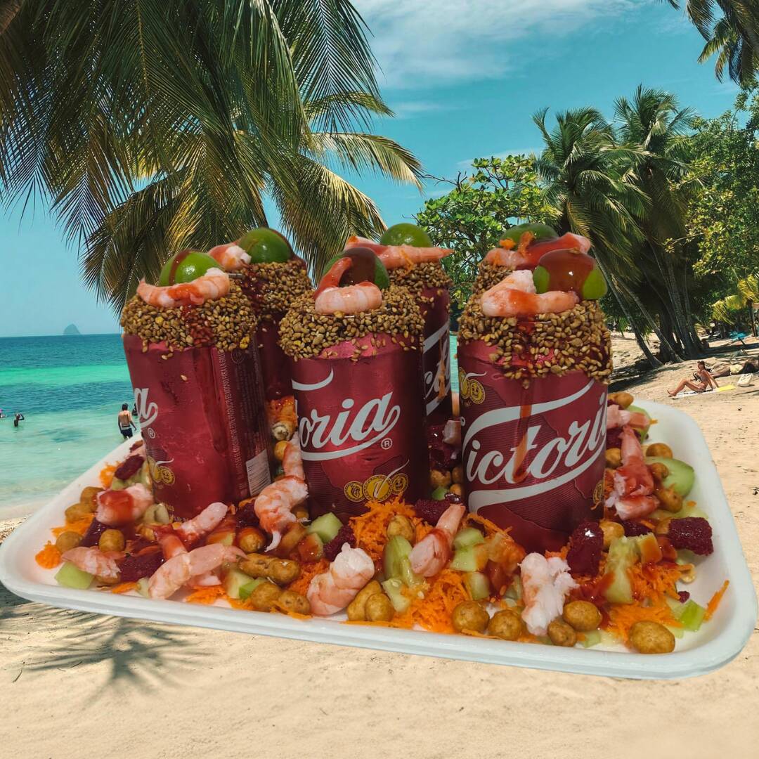 Six pack de victoria o corona de 355ml escarchadas con tamarindo y ajonjolí con snacks y camarón coctelero bañados en salsa de la casa y tajin