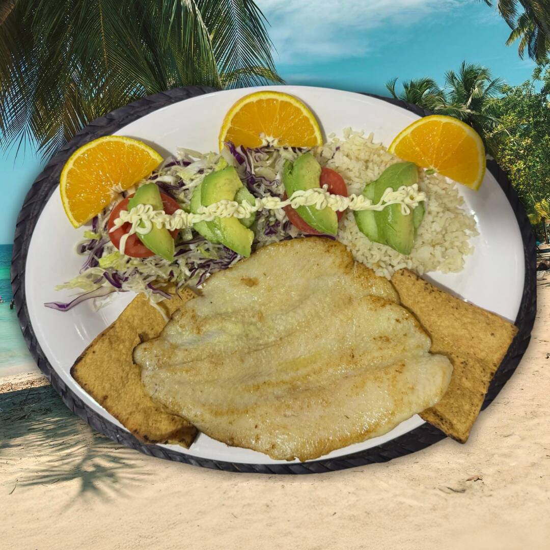 Mojarra al mojo de ajo acompañada arroz, ensalada de col morada, blanca, aguacate, jitomate, pepino y naranja