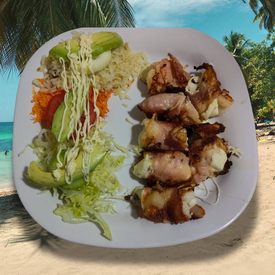 Empanada rellena con ingrediente a elegir acompañado de aguacate, mayonesa y cátsup. (Opcional) con guarnición de arroz y ensalada: lechuga, pepino, jitomate, aguacate, naranja y mayonesa.
