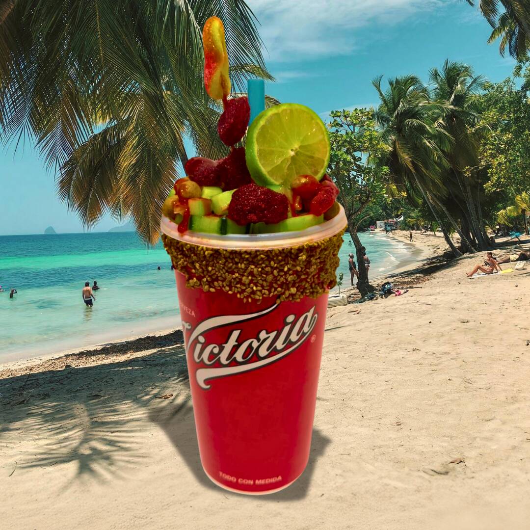 Cerveza Victoria o Corona de 1LT con un escarchado de tamarindo con ajonjolí (o piquin) sal, limón y tajin con pepino, cacahuates y gomitas bañados en chamoy y tajin