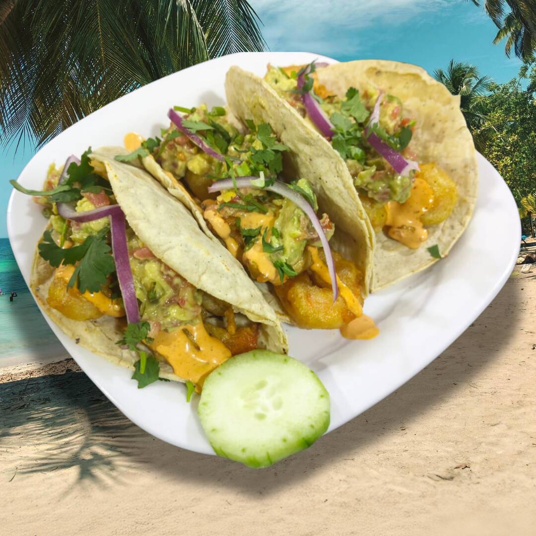 Orden de tres tacos de camarón (rebozados) con guacamole y aderezo