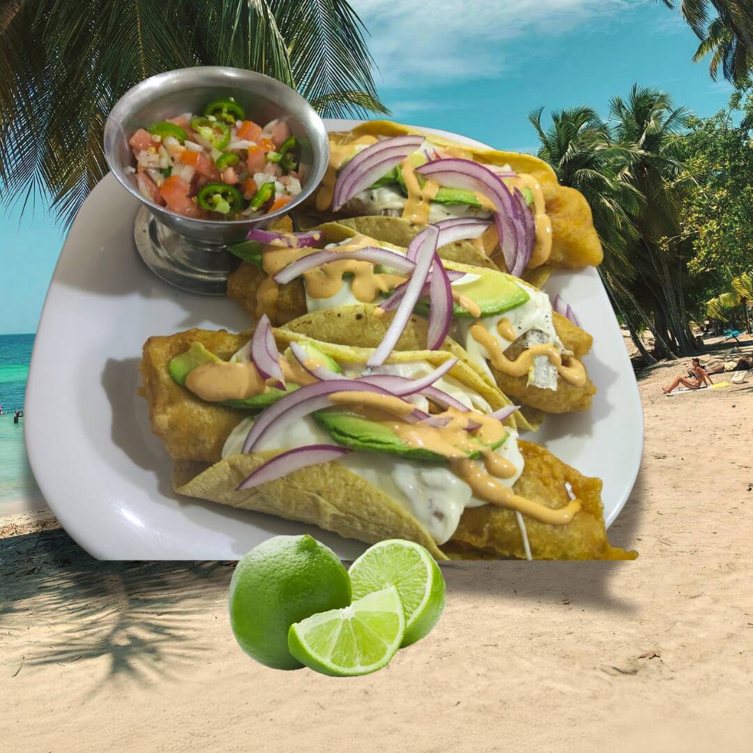Tacos de pescado rebozados en harina con aderezo estilo ensenada con queso derretido y pico de gallo