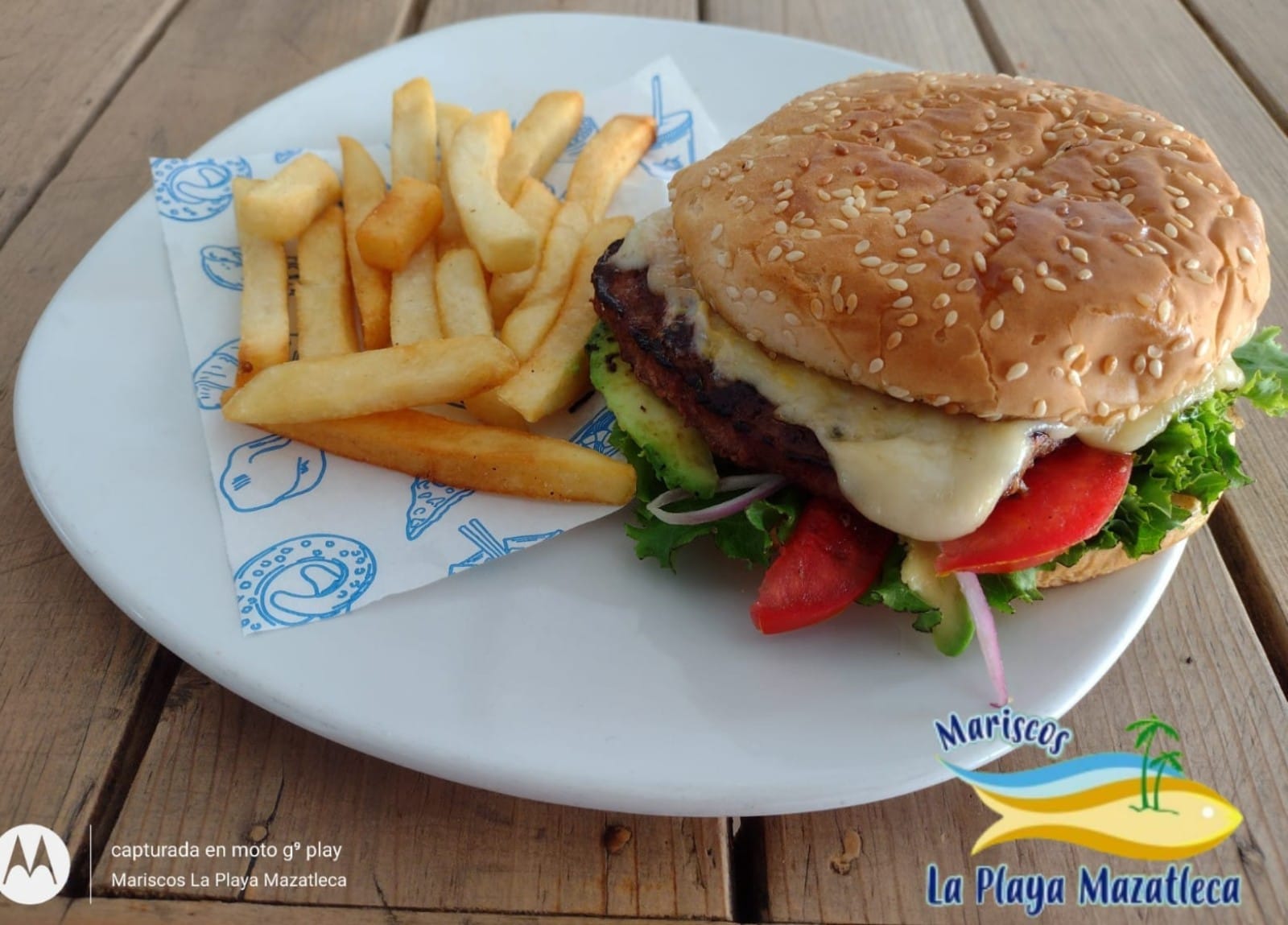 Hamburguesa de Carne, queso gratinado y papas francesas.