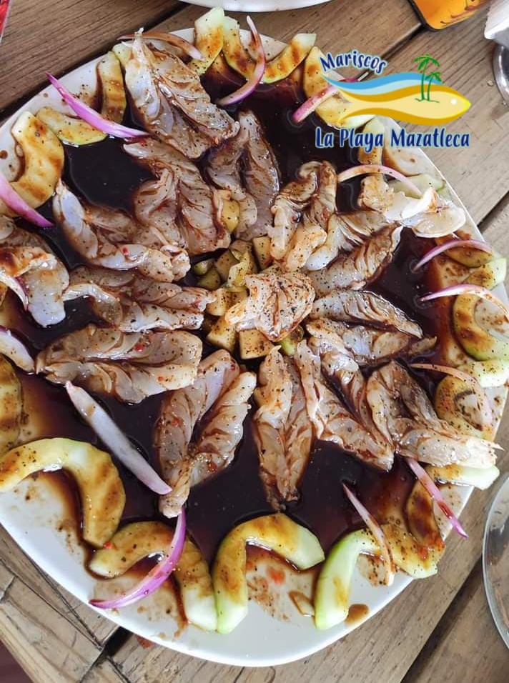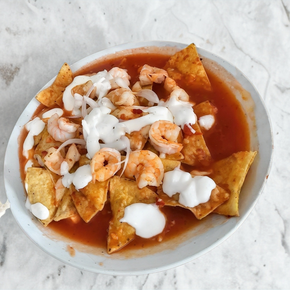 Camarón fresco en salsa negra y Tostitos o Doritos.