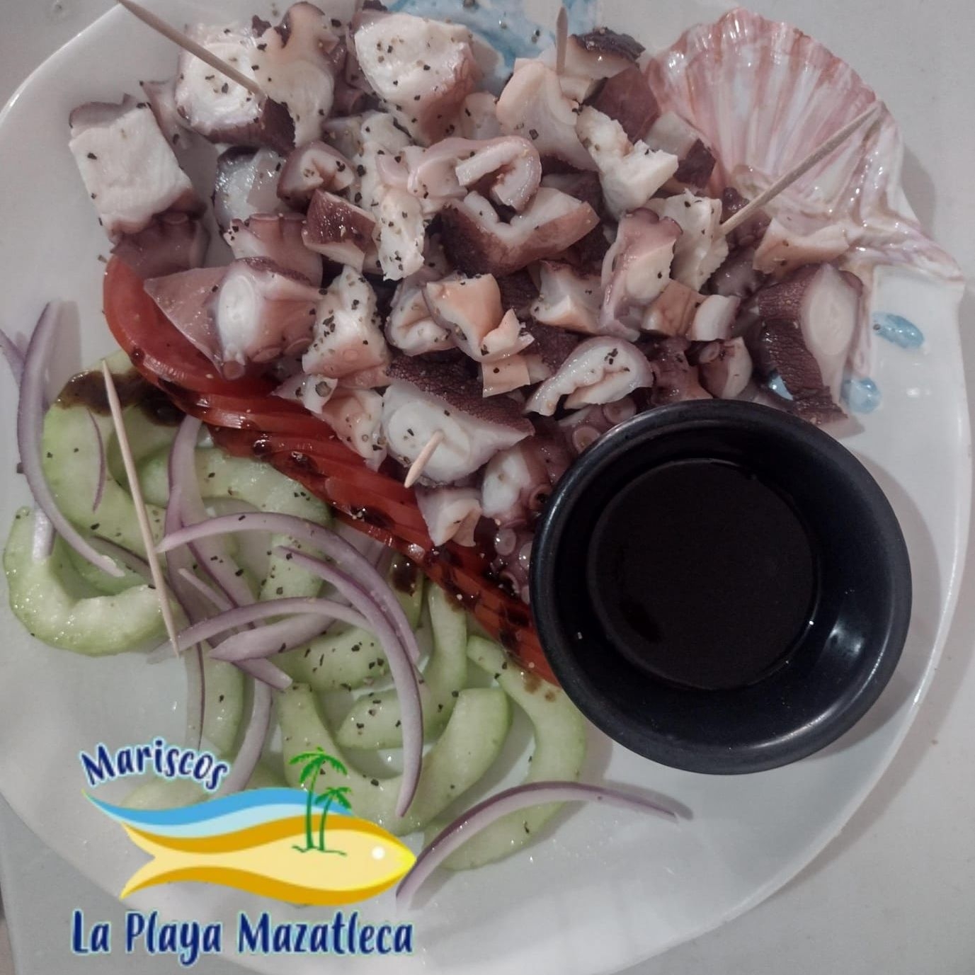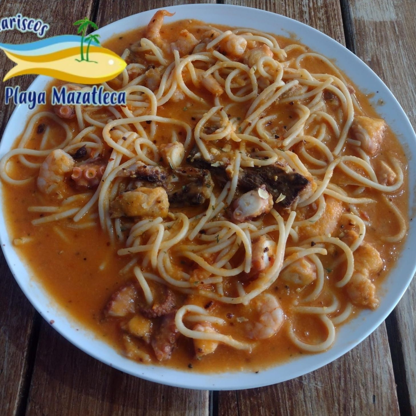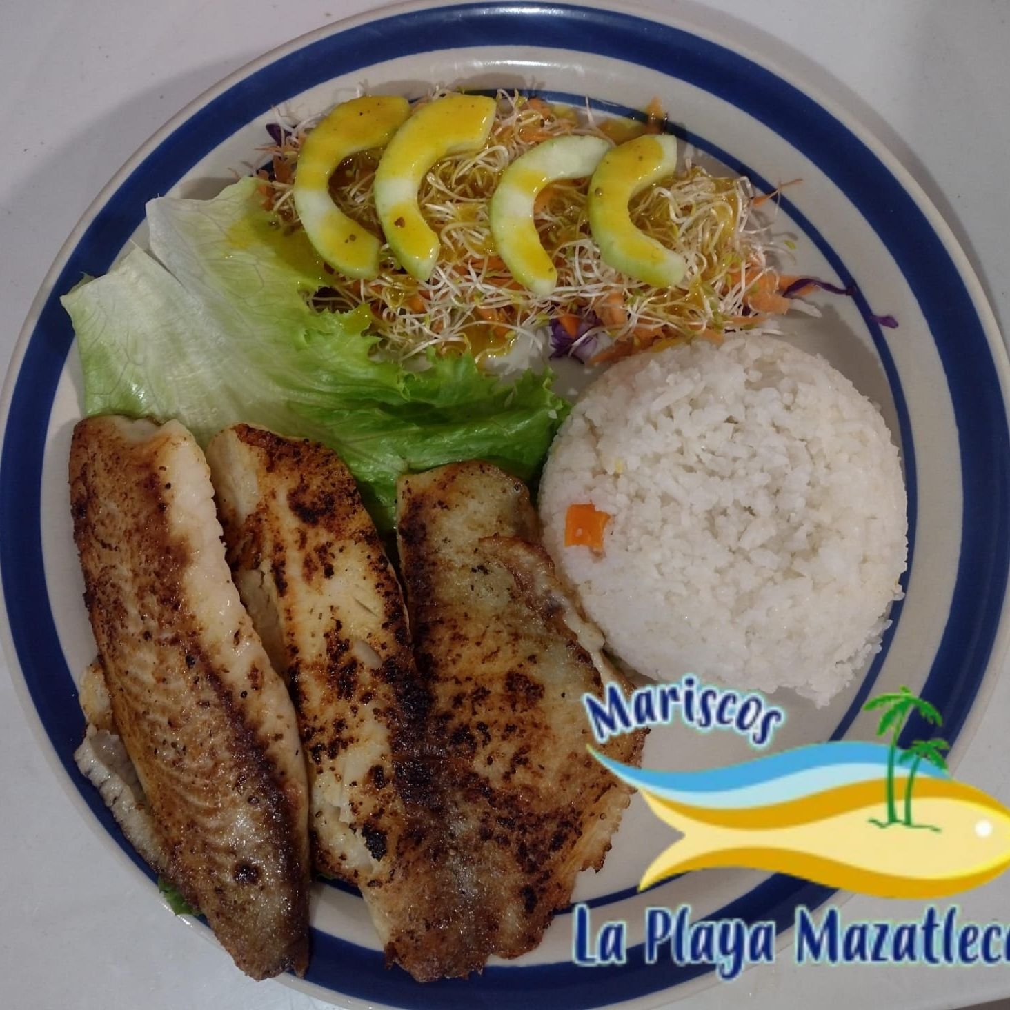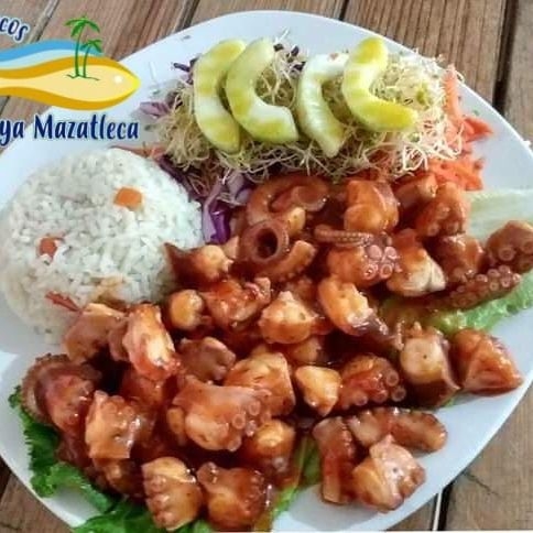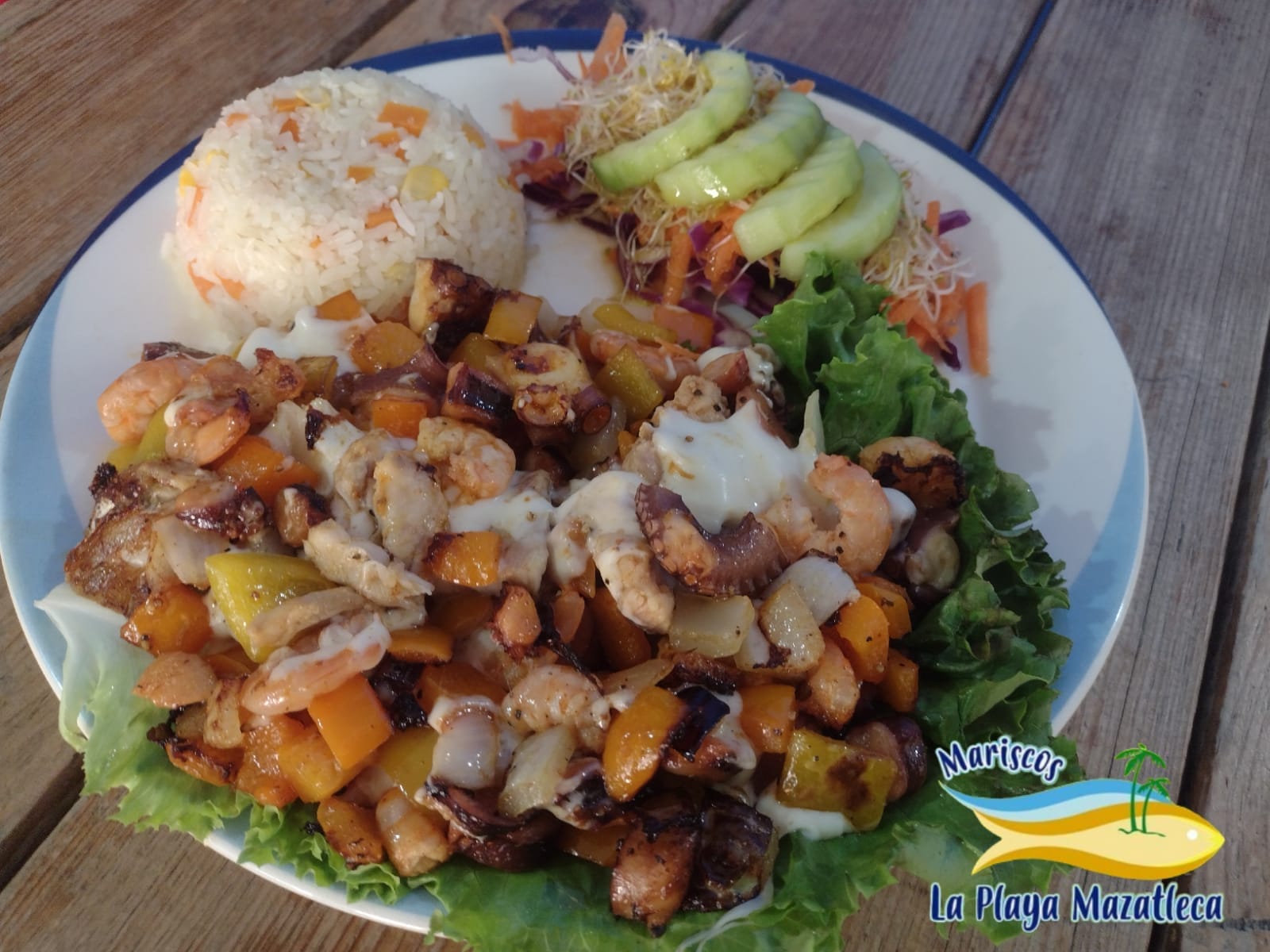 Pulpo, camarón, pescado. Se acompaña de arroz y ensalada.