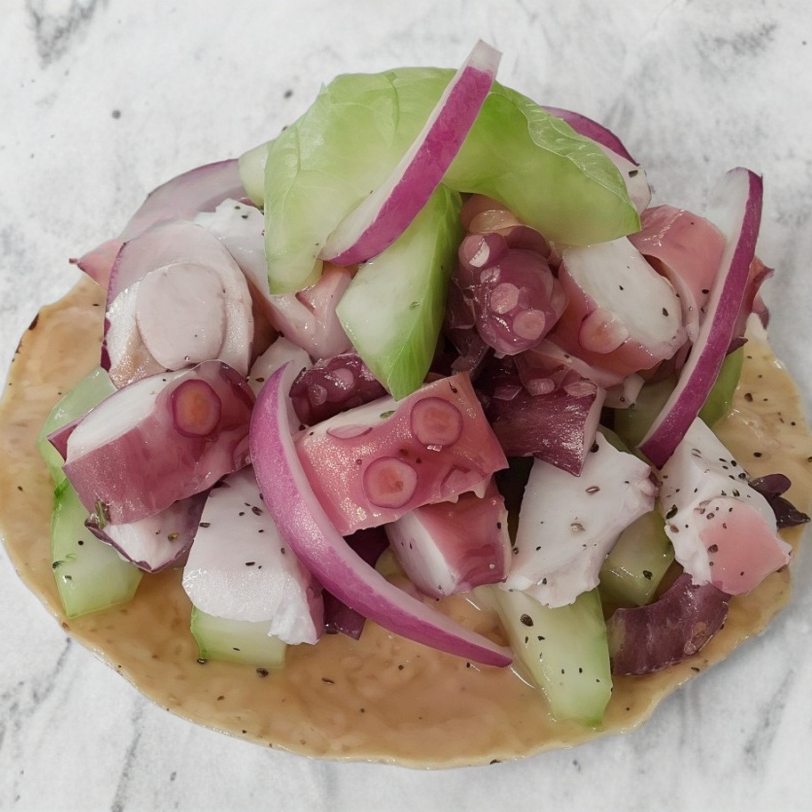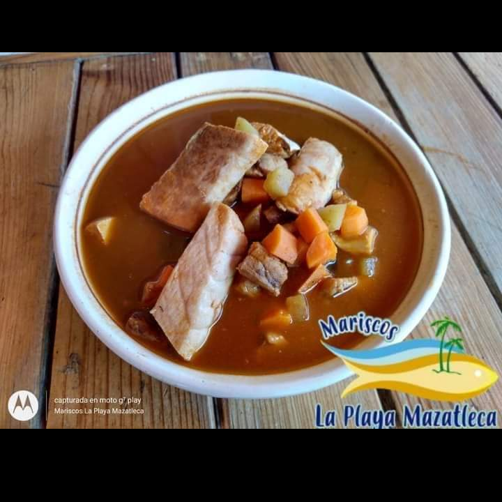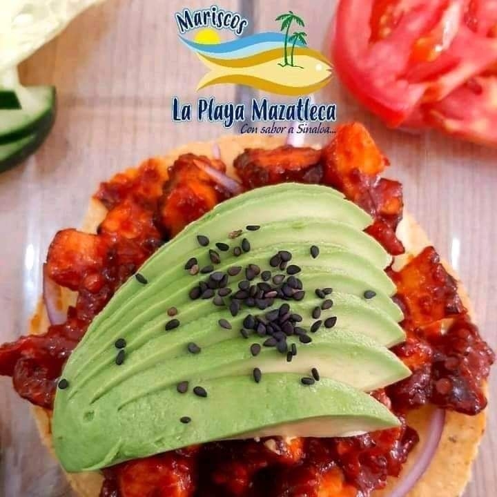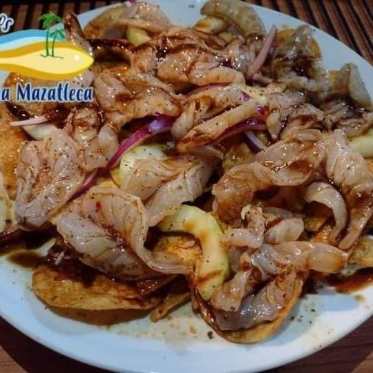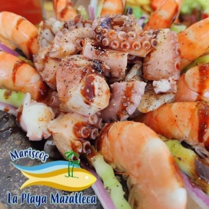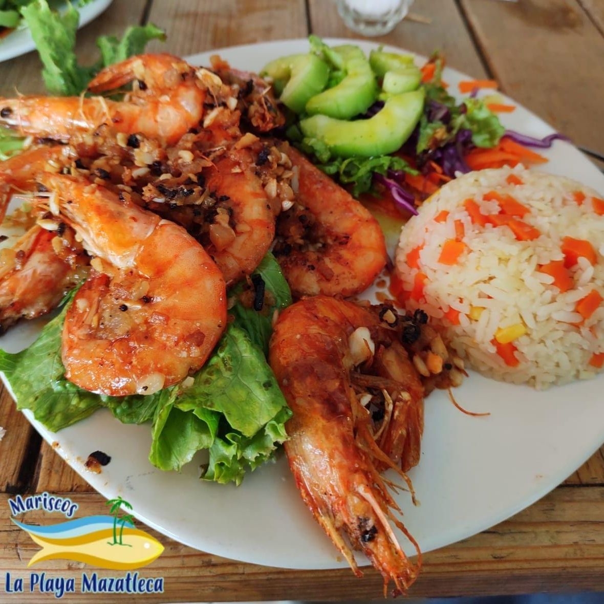 Pulpo, camarón, pescado. Se acompaña de arroz y ensalada.