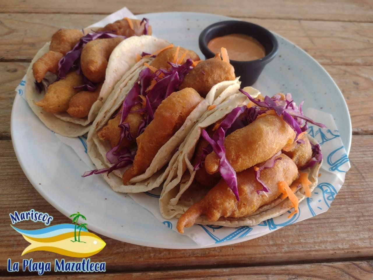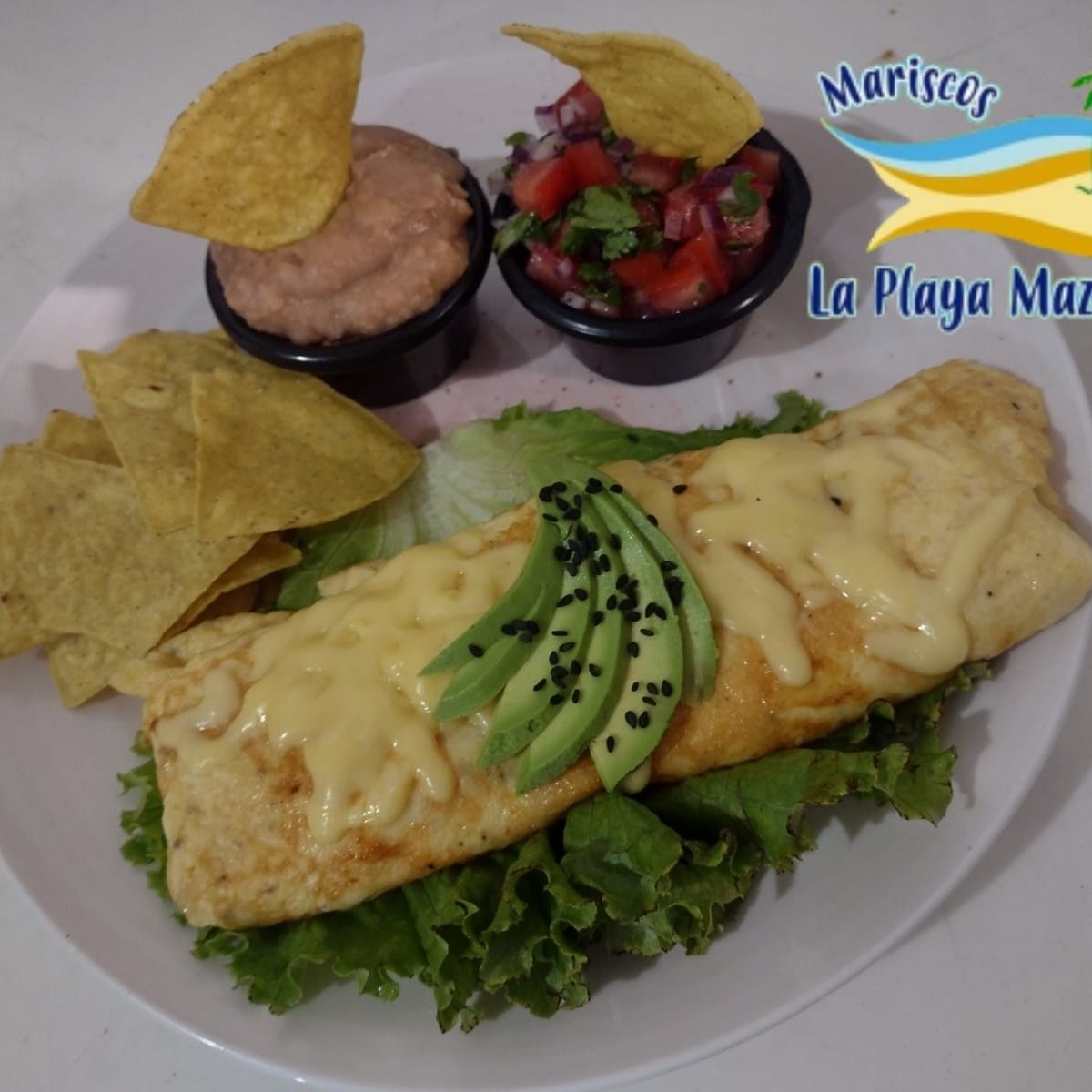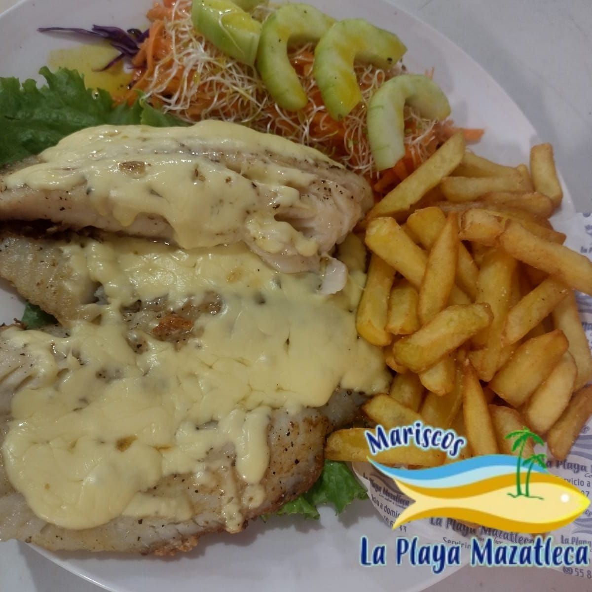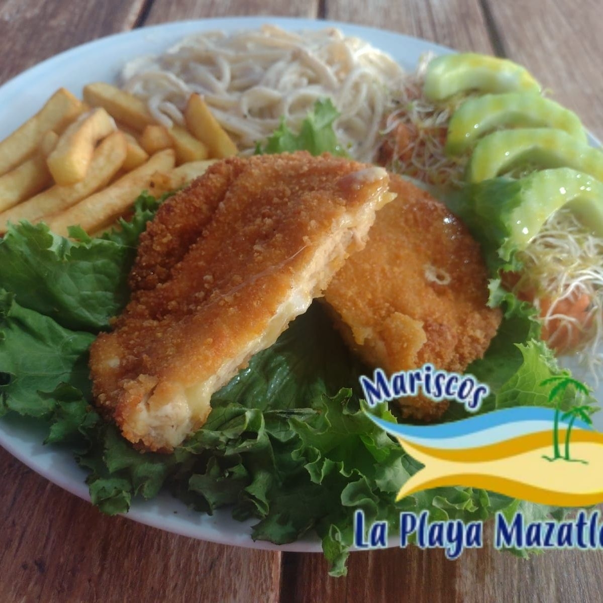 Camarón, pulpo, pescado, calamar, queso. Se acompaña de arroz y ensalada.