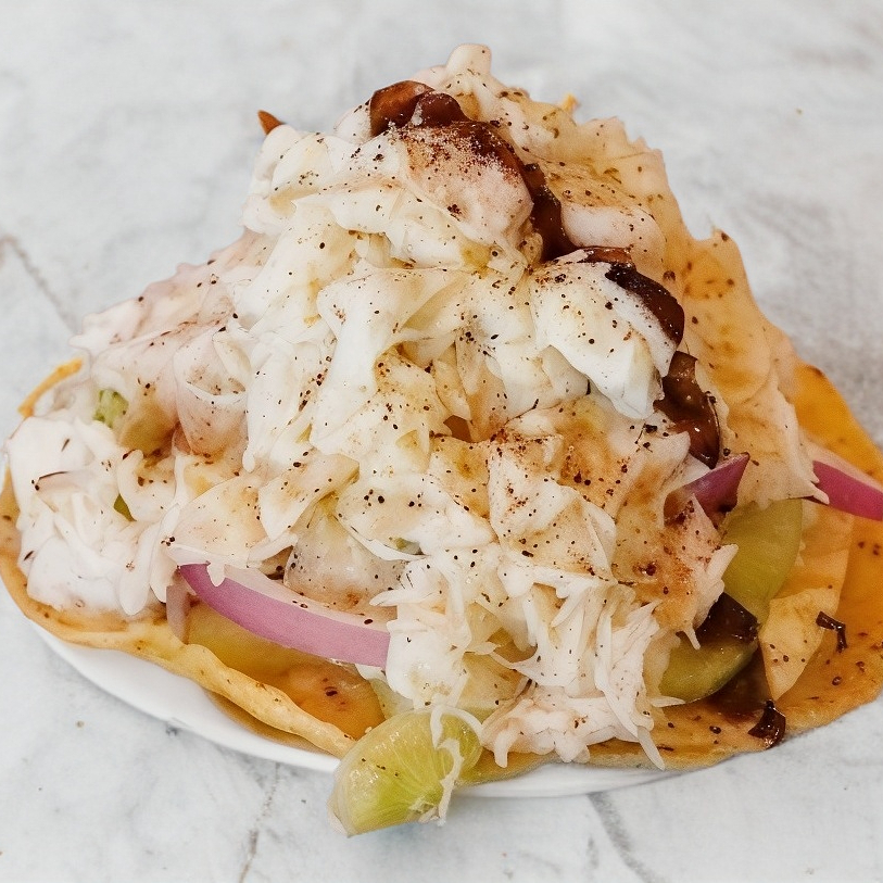 Quesadillas de masa de maíz fritas de pescado marlin ahumado y ensalada. 3 Piezas.
