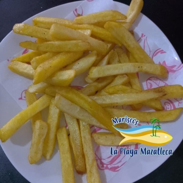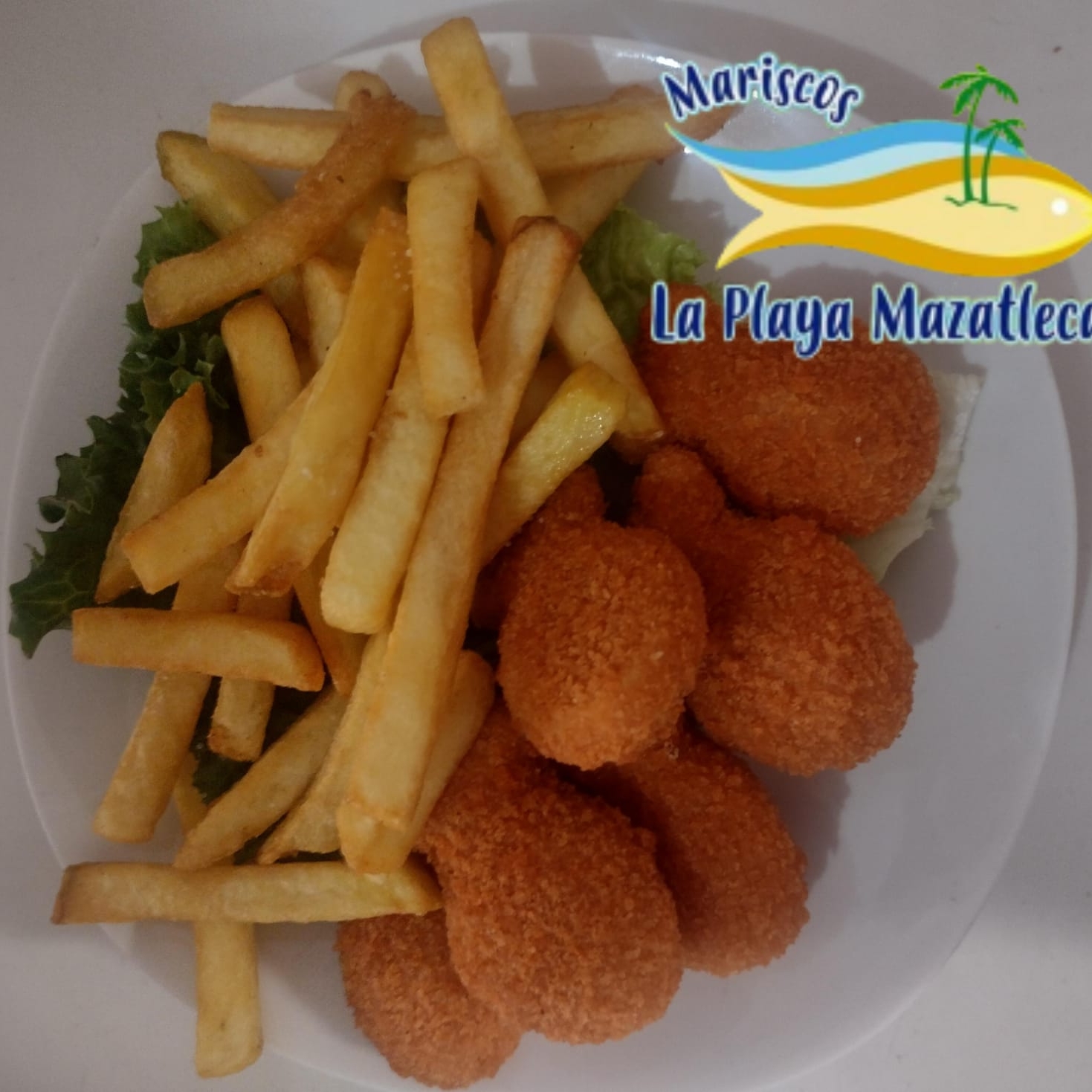 Camarón, surimi, queso gratinado con papas a la francesa.
