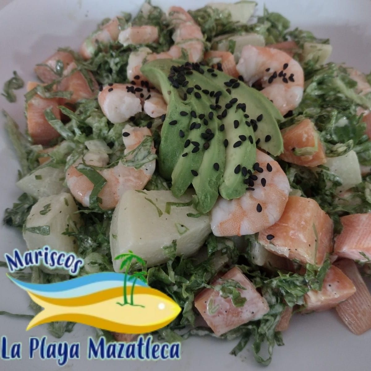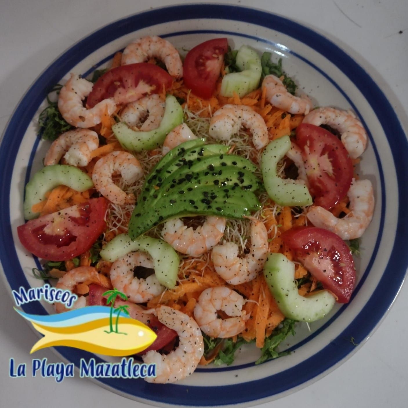 Camarón cocido, papa, zanahoria, lechuga y mayonesa.