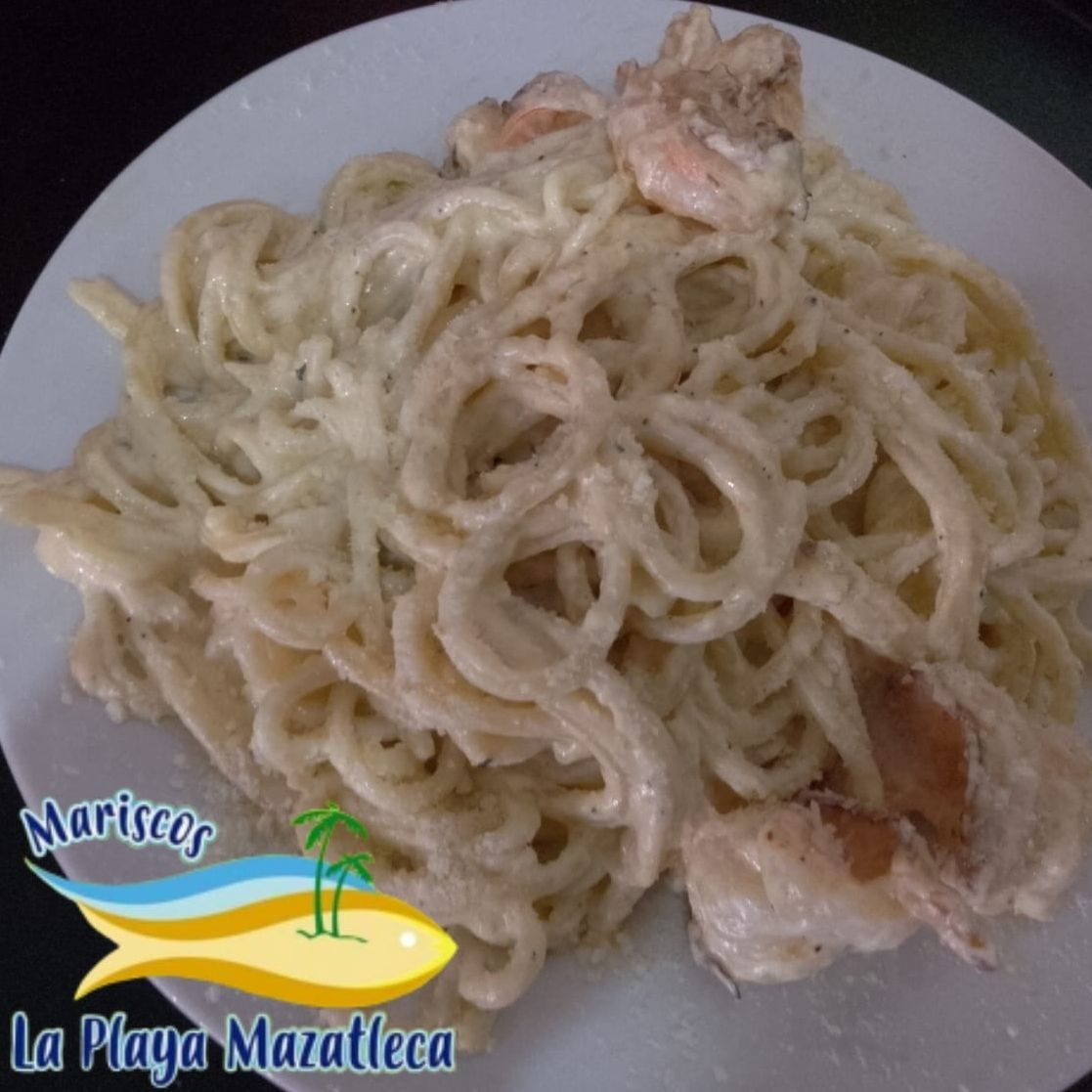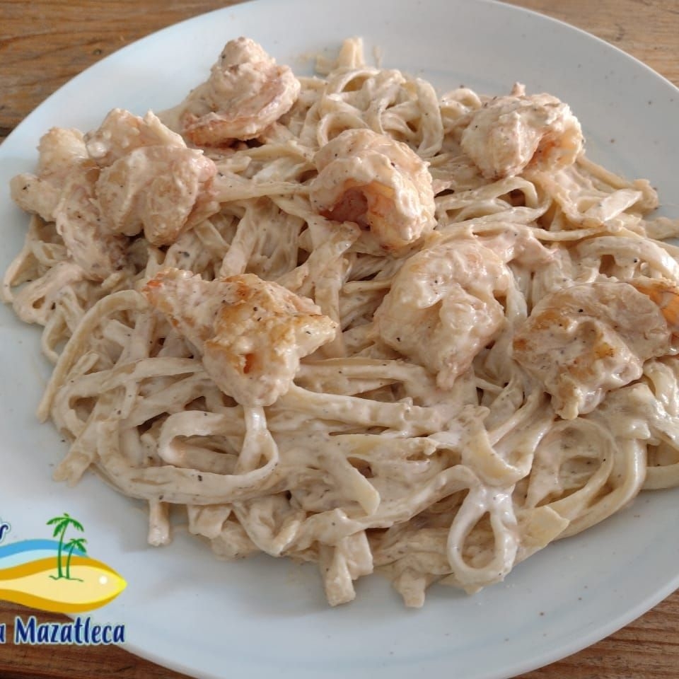Pasta de fetuccini con camarones en crema. Se acompaña de arroz y ensalada.