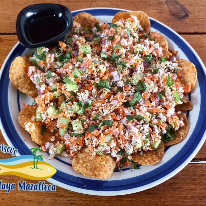 3 Piezas de tortilla de maíz frita con pescado y aguacate.