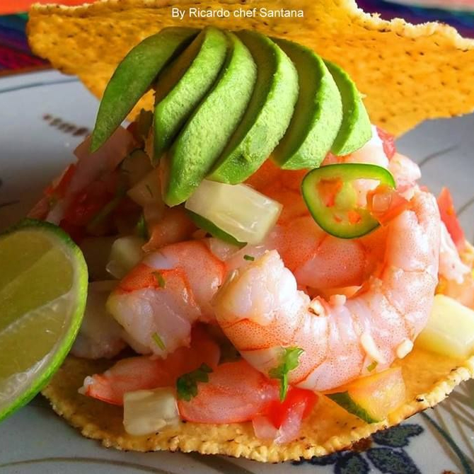 Camarón, Cebolla, Cilantro y Aguacata