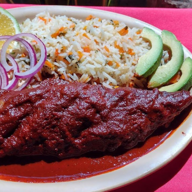 Acompañado de ensalada de lechuga, cebolla morada, jitomate, aguacate y arroz blanco
