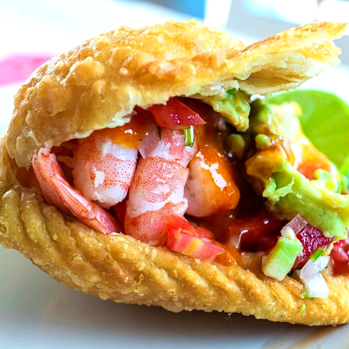 Empanada de Camaron (aguacate, cilantro, cebolla, catsup, mayonesa)