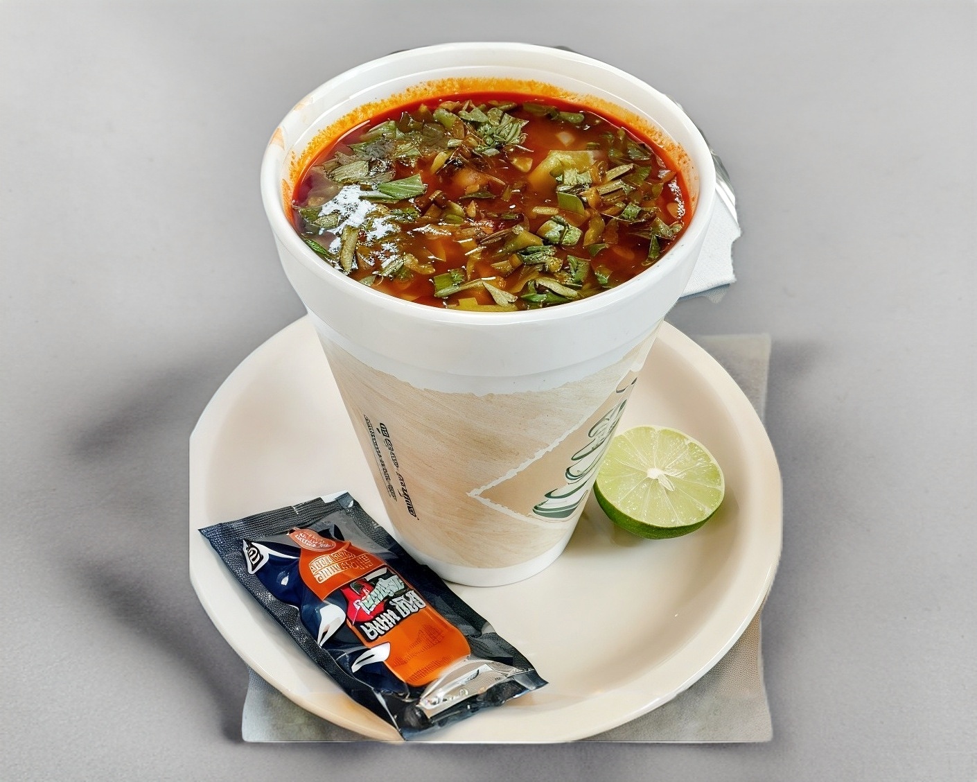 Caldo solo (311 ml) con cilantro, cebolla, salsa y limón aparte.