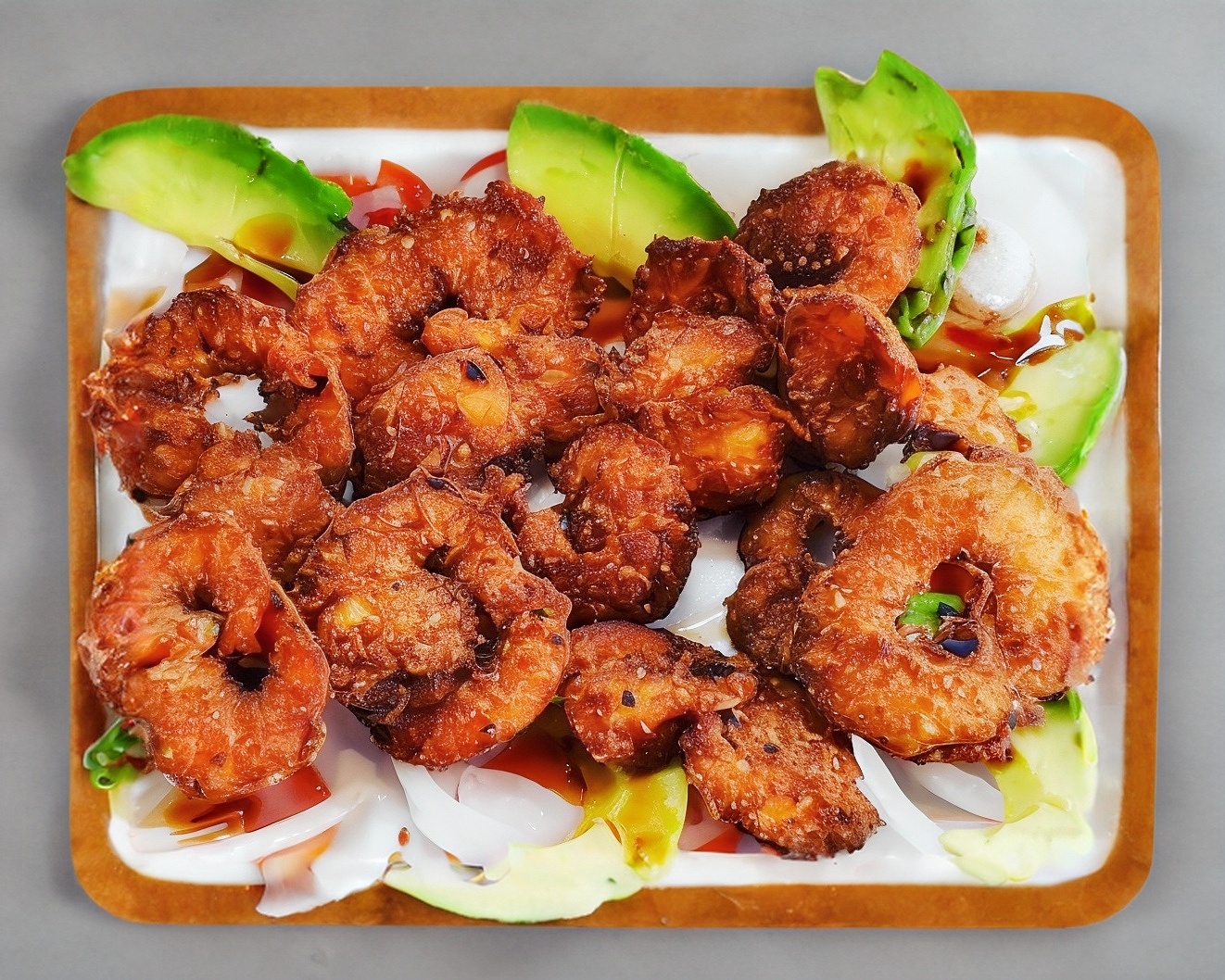 12 Camarones empanizados. guarnición cebolla, jitomate y aguacate. (Limón y salsa aparte) con pan o galleta.