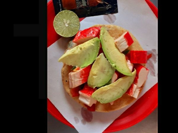 Tostada de surimi, mayonesa, cilantro, cebolla, aguacate, salsa inglesa, salsa bruja (limón y salsa aparte).