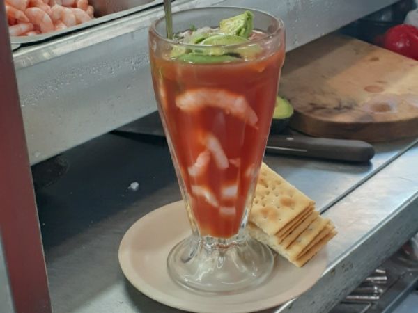 Camarón con ostión, cilantro, cebolla, aguacate, salsa inglesa, aceite oliva, cátsup, limón.