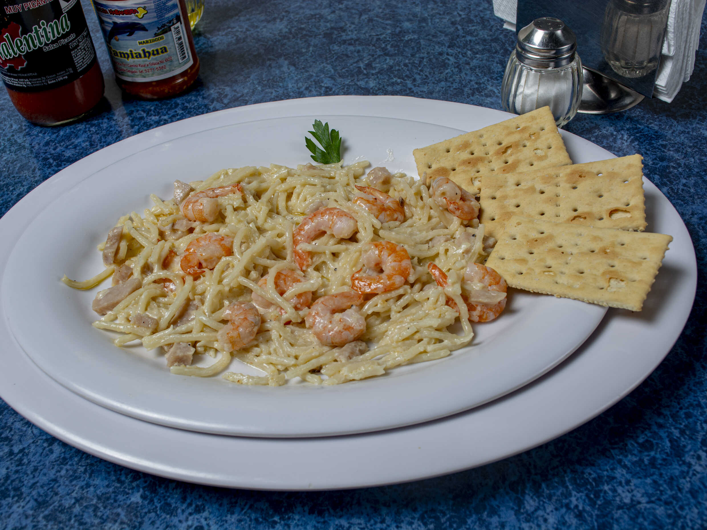 Rico espagueti con Camaron a la crema con trocitos de jamón y queso parmesano.