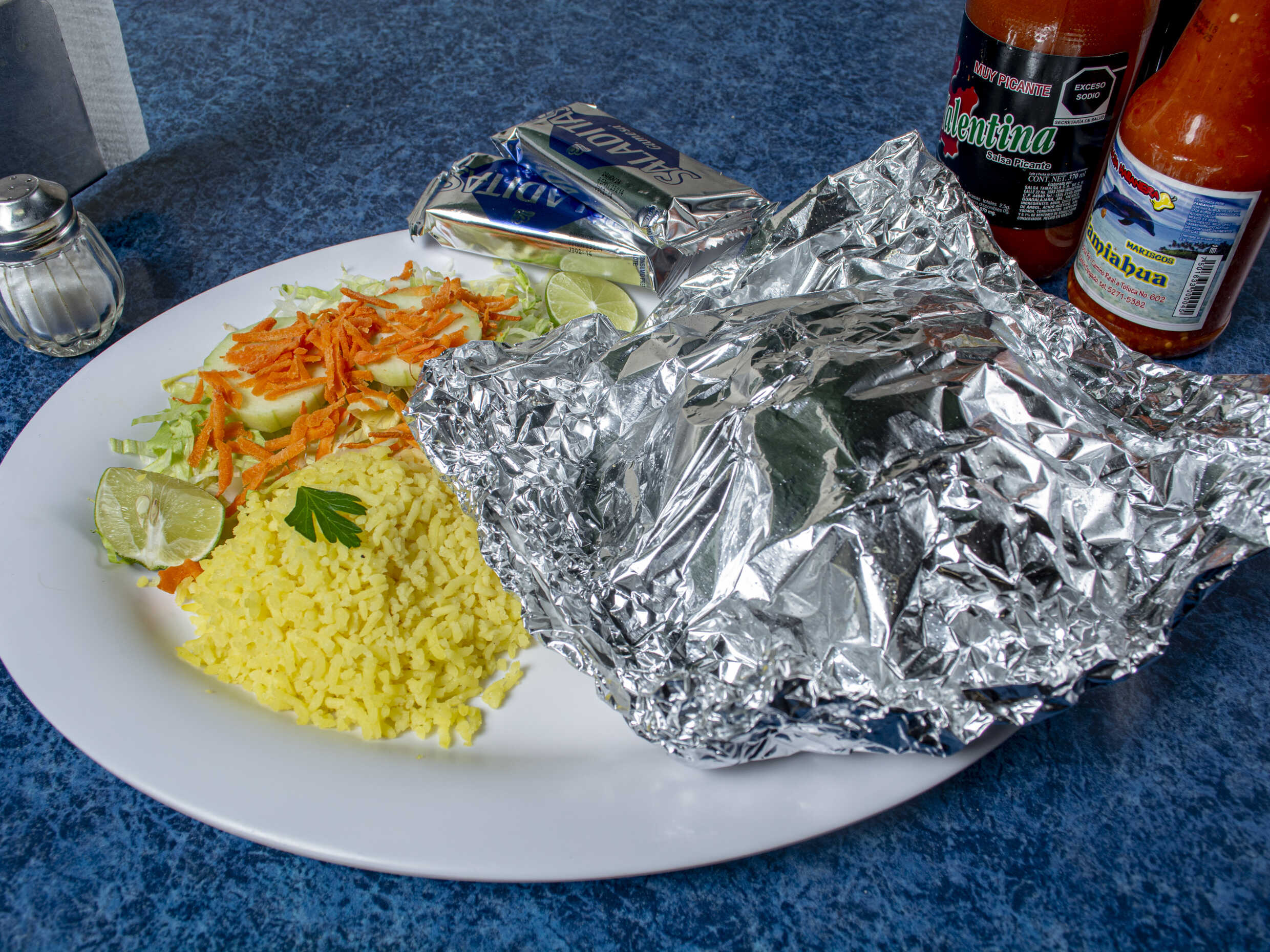 Filete empapelado relleno de pulpo con camarón o al gusto, sazonado con, jitomate y epazote acompañado de arroz y ensalada.