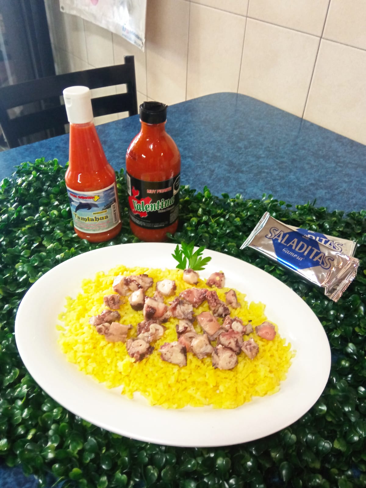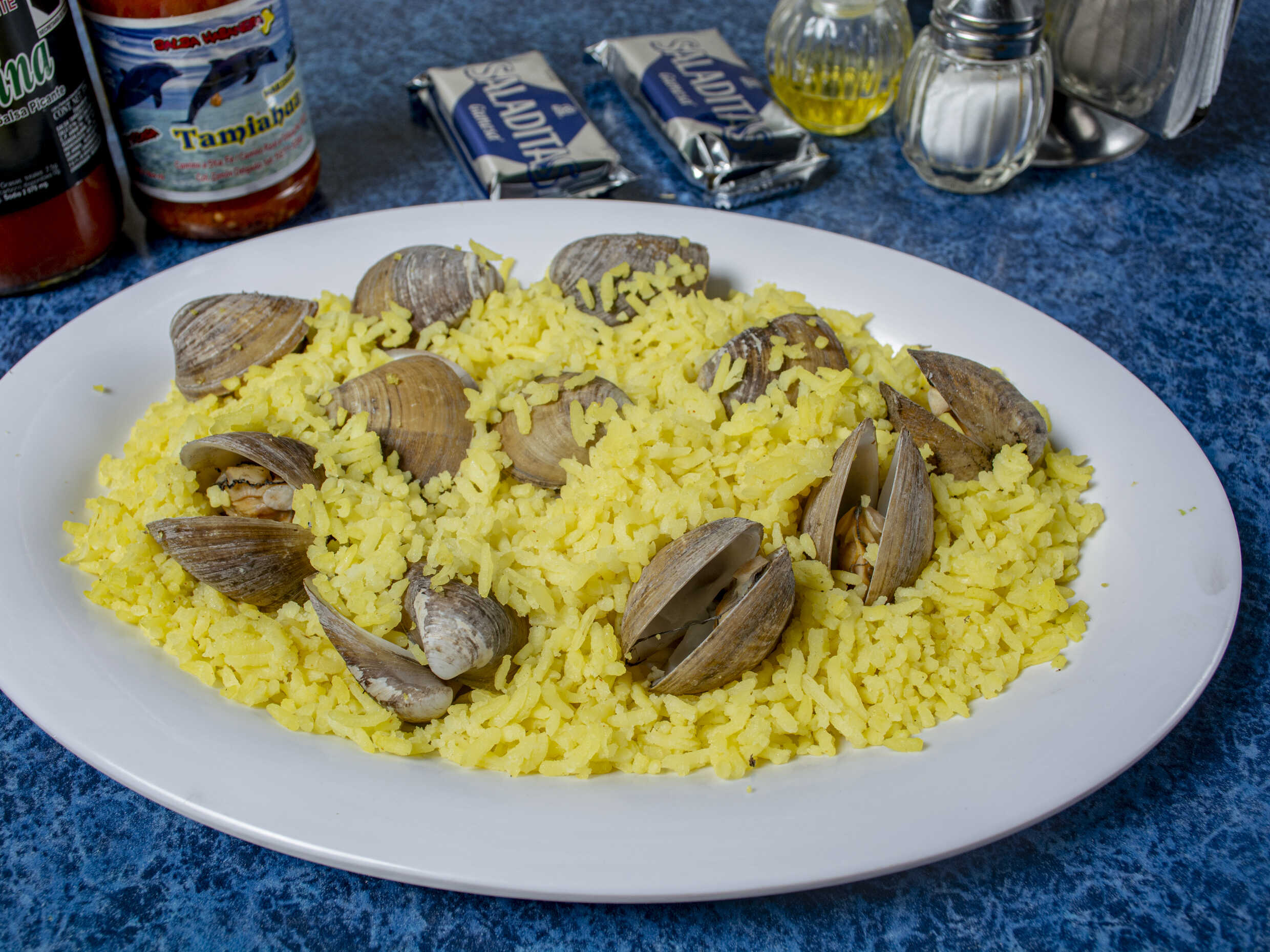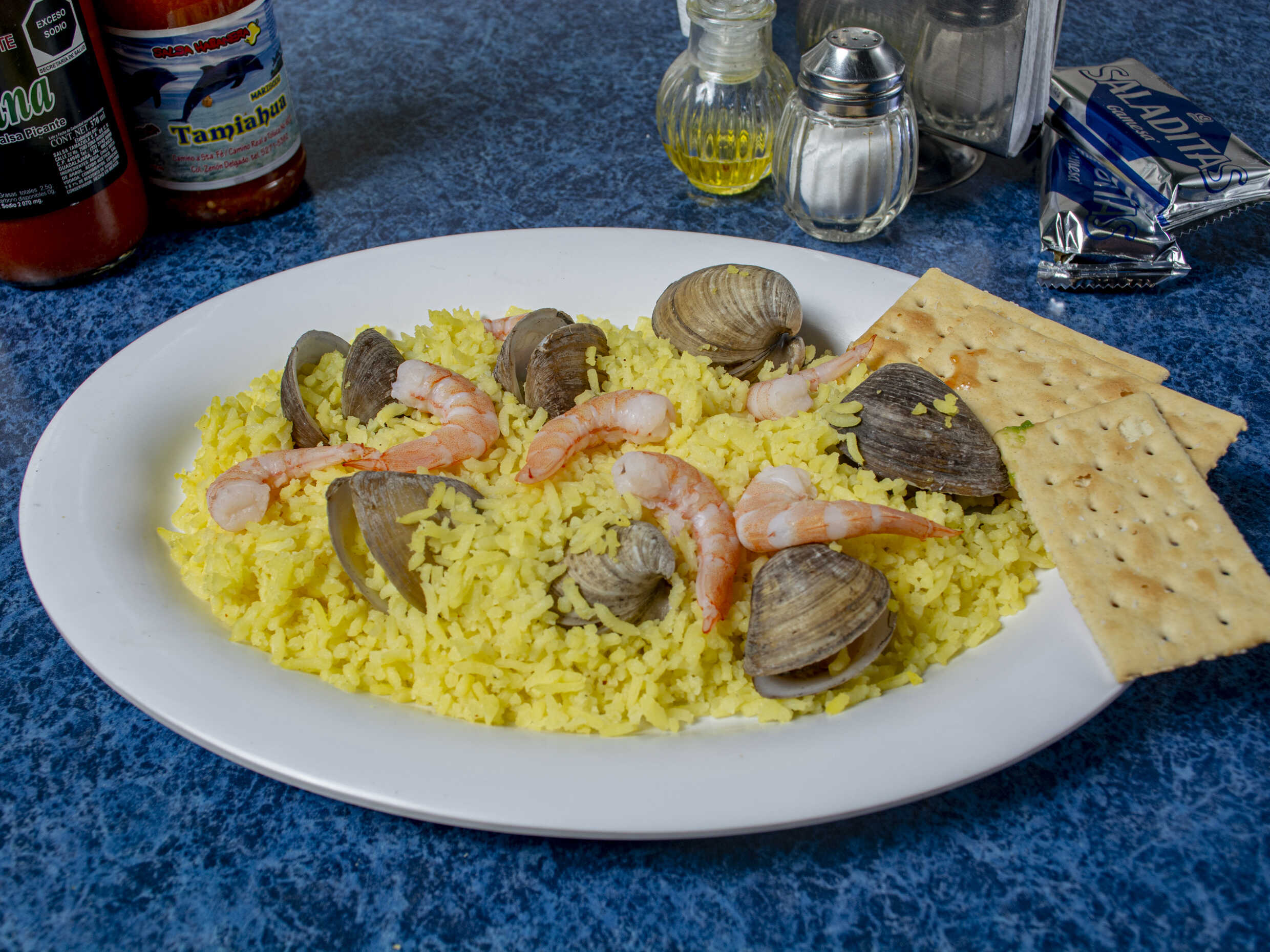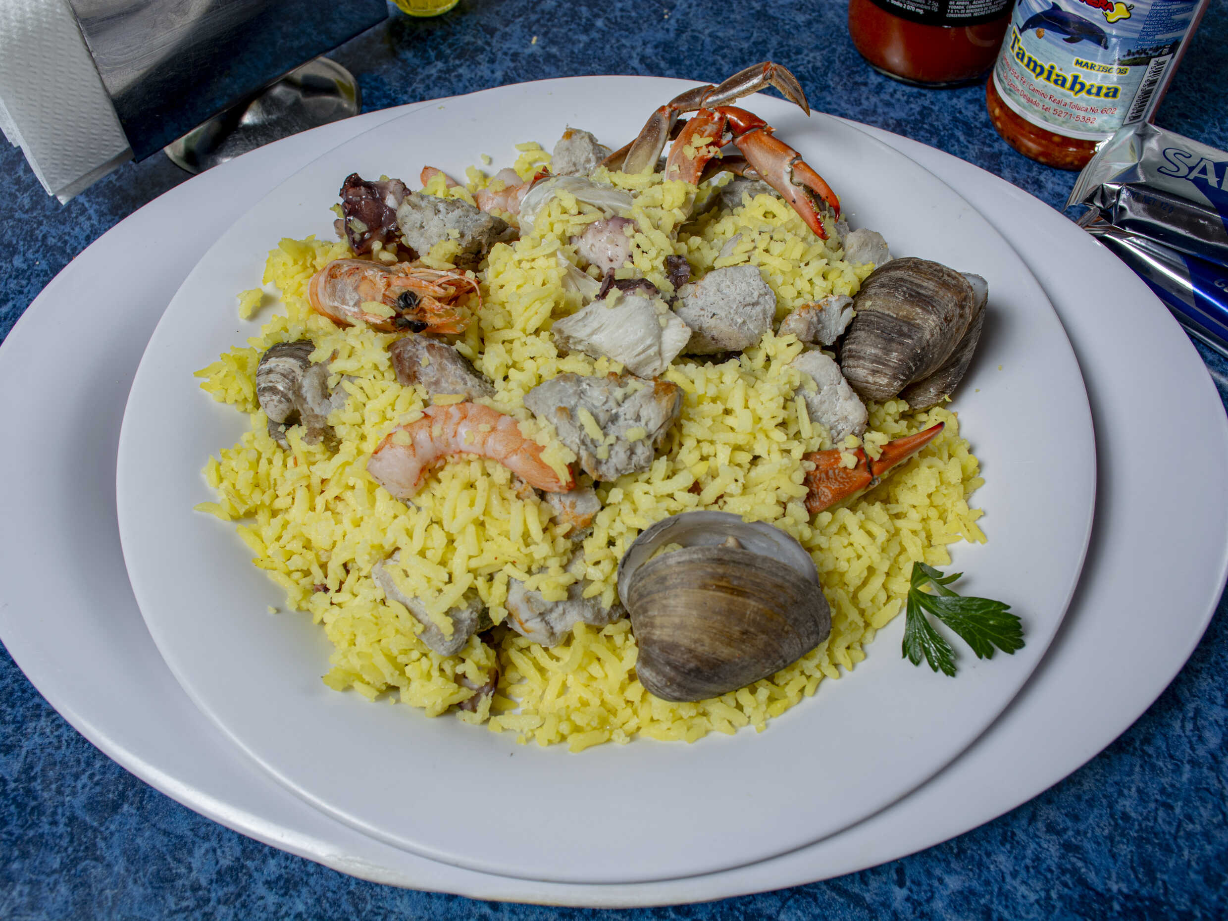 Delicioso Arroz de la casa con camarón para pelar, almeja, jaiba, pulpo y pescado