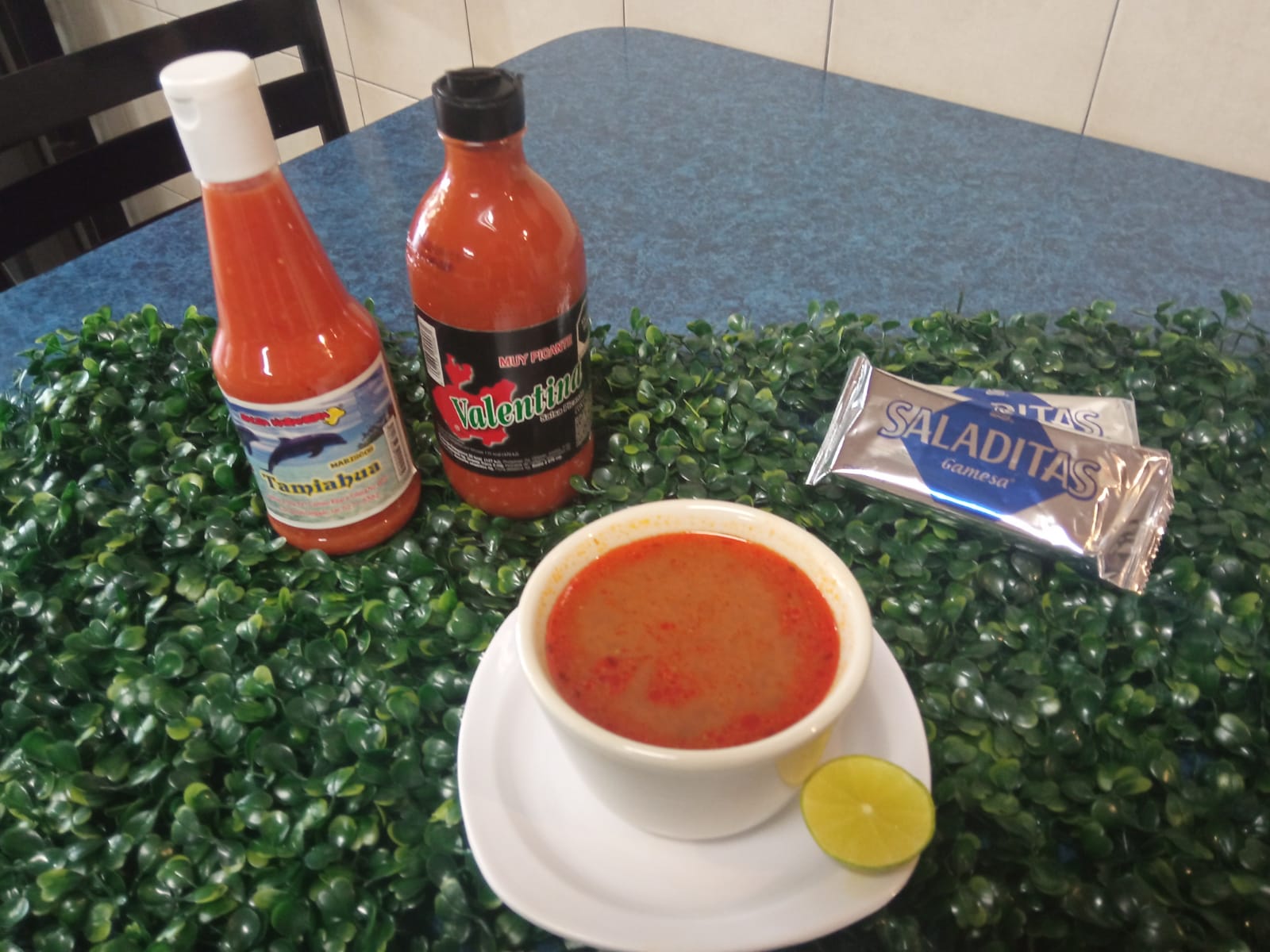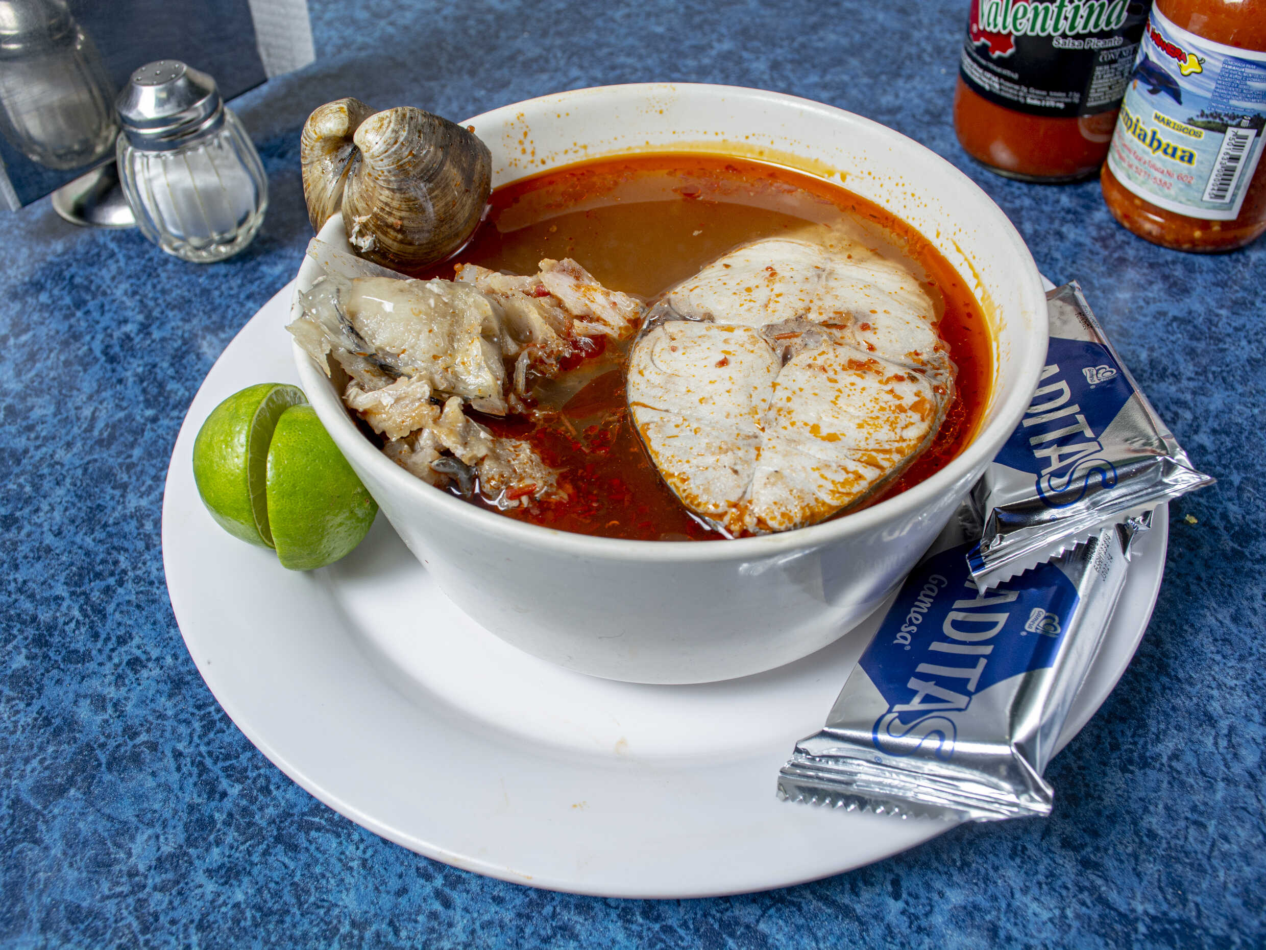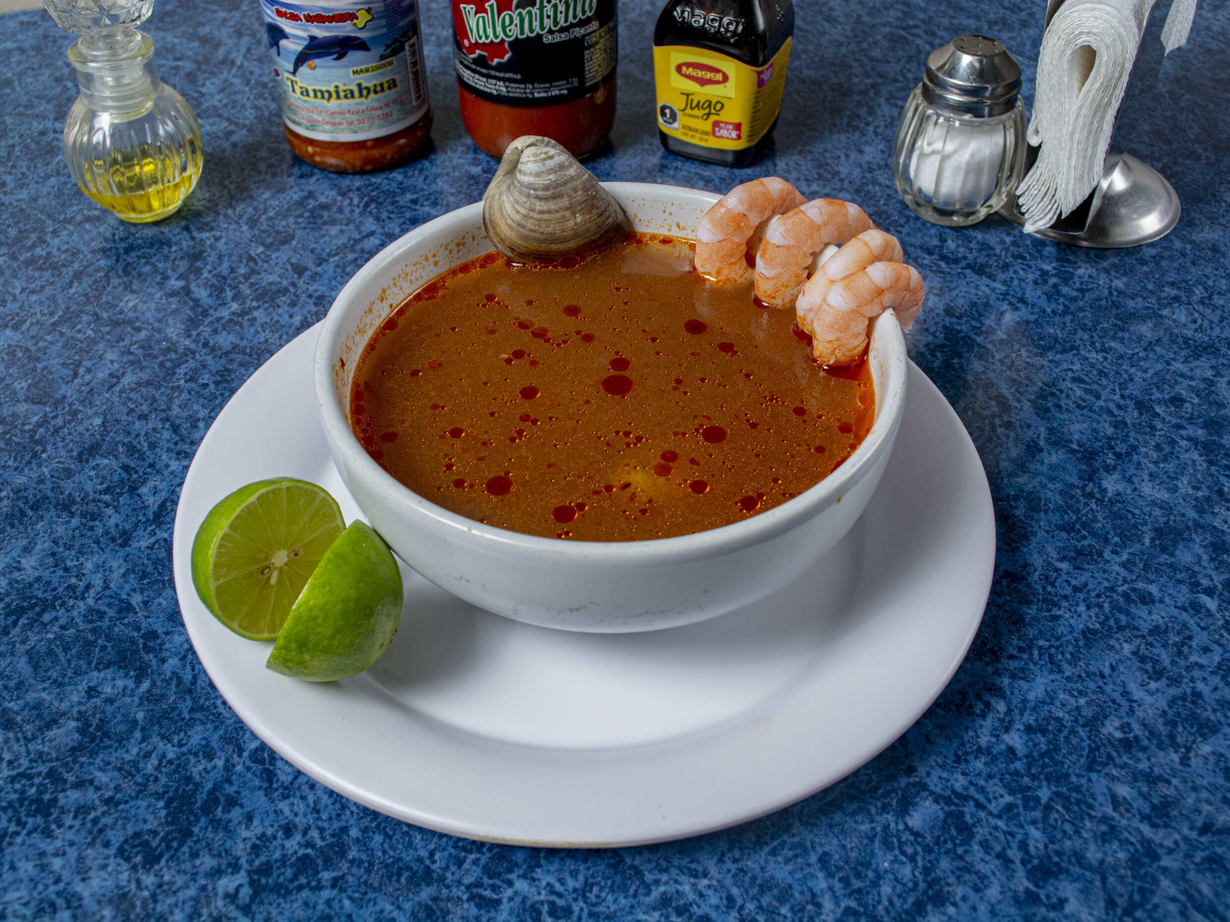 Caldo con, camarón pelado y para pelar, almeja, ostión, pescado, surimi, callo, pulpo y calamar.