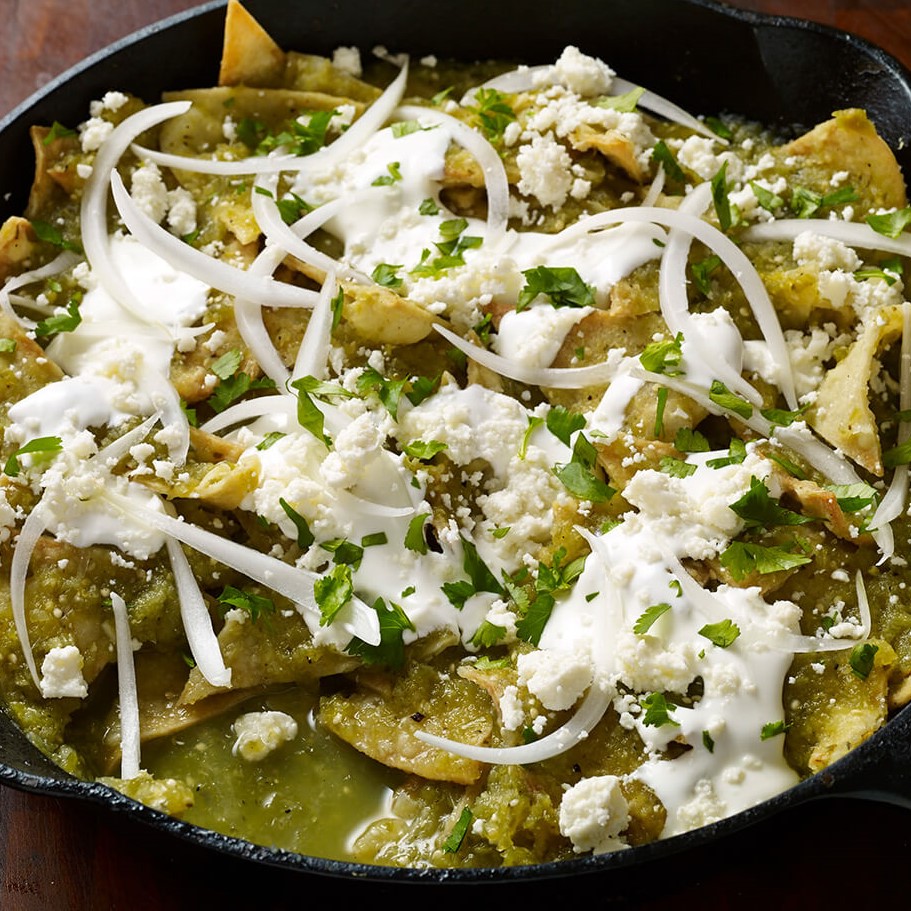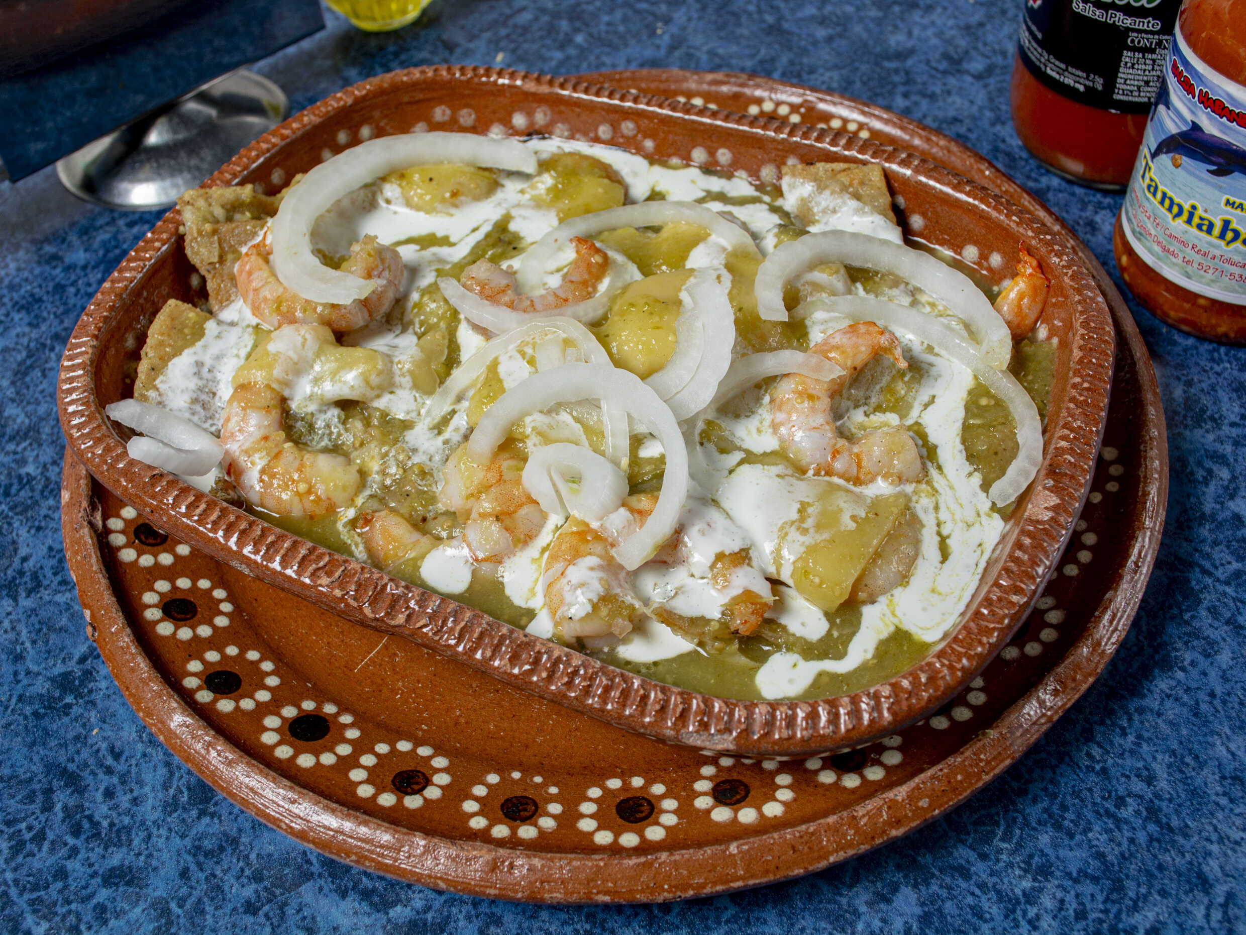 Exquisitos chilaquiles verdes con Camaron,crema,queso y cebolla