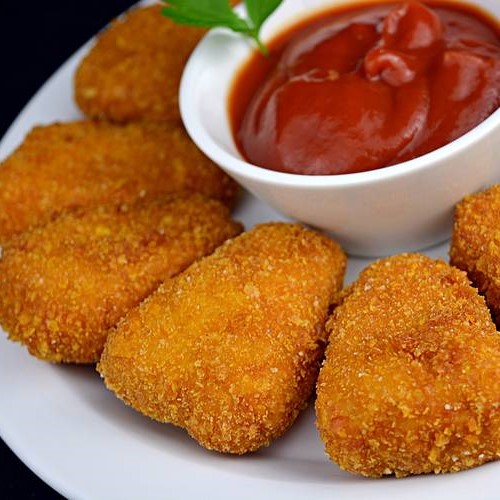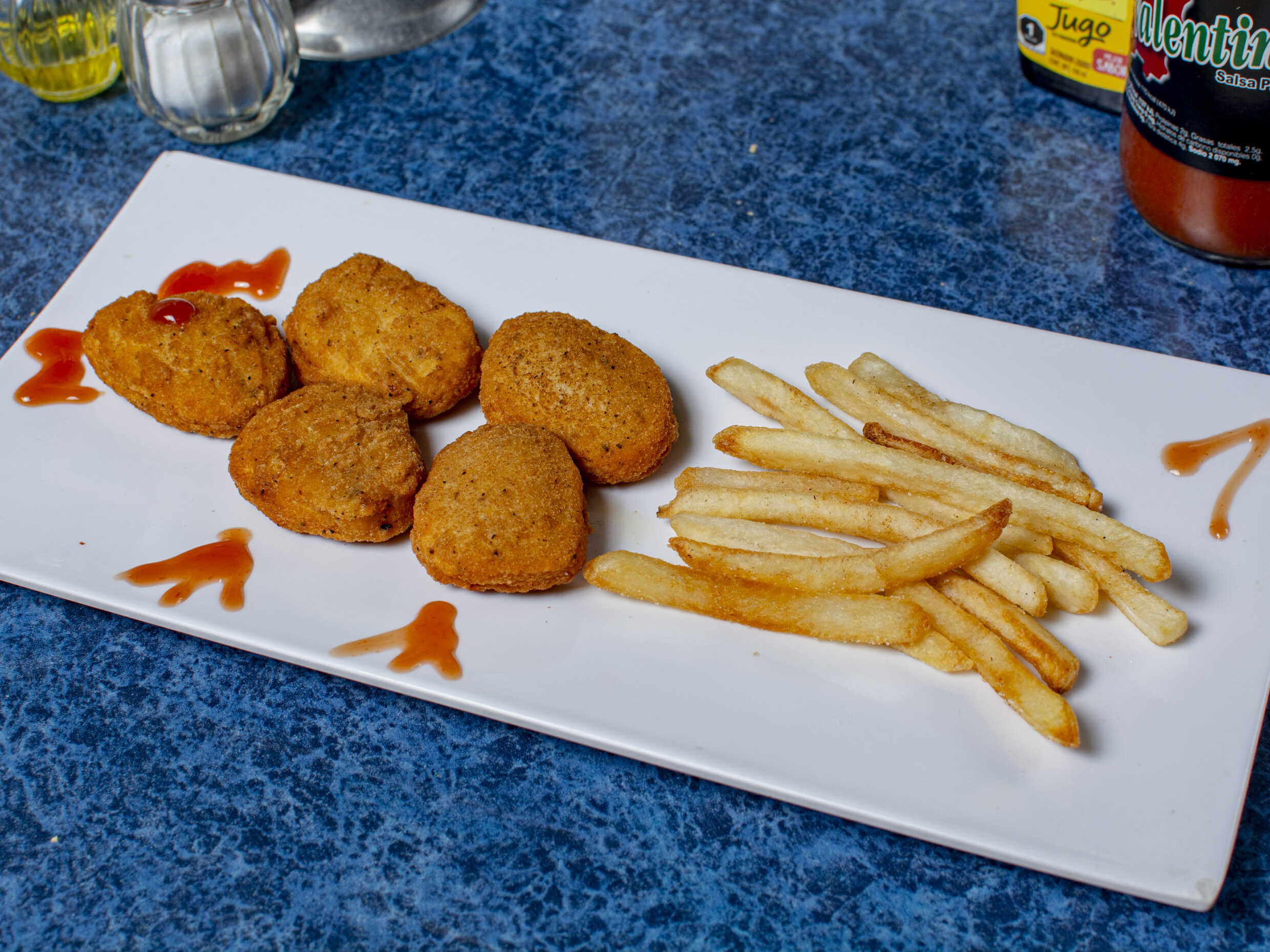 5 Pzas. de nuggets de pollo acompañados de ensalada arroz o papas a elegir.