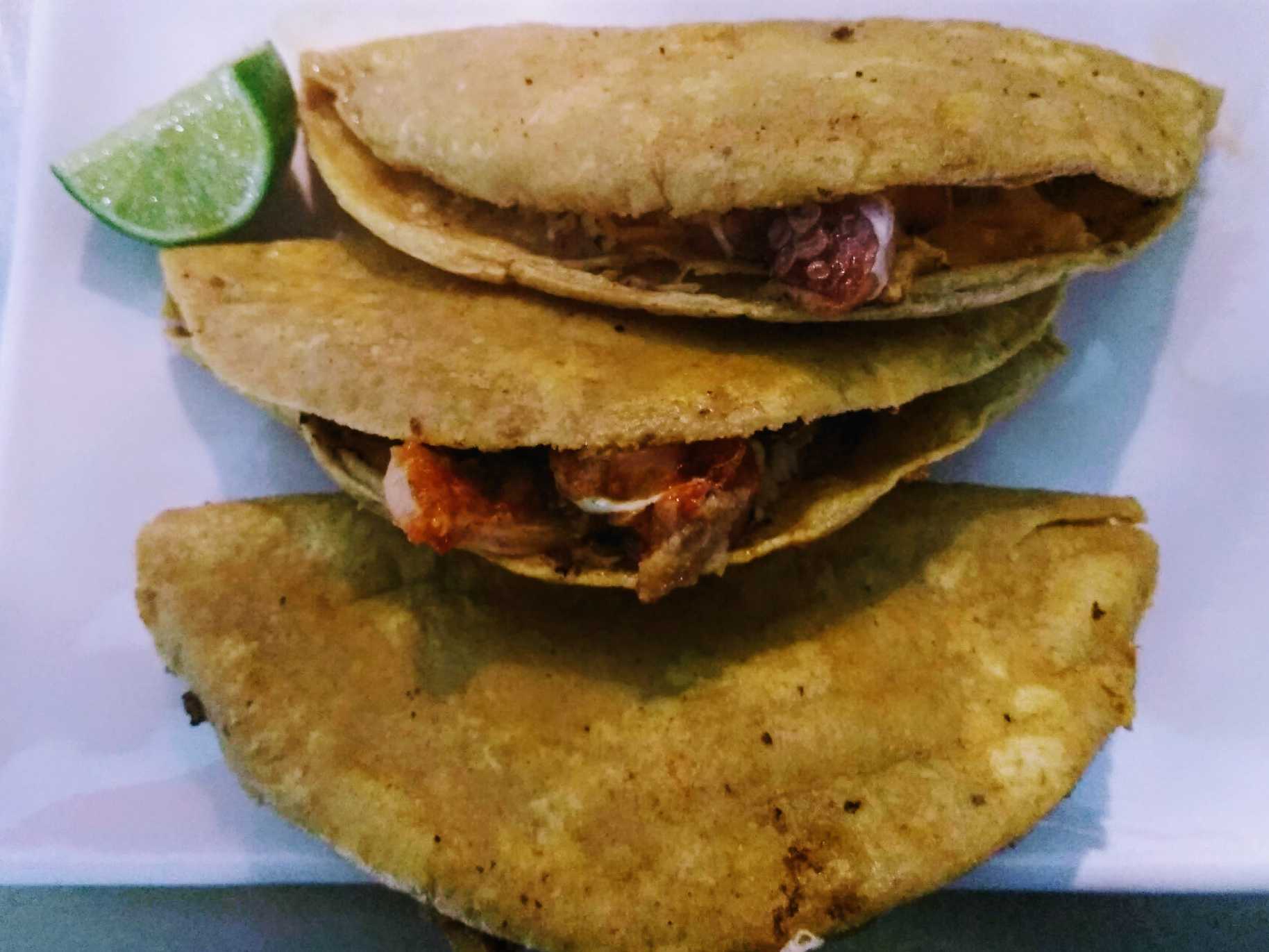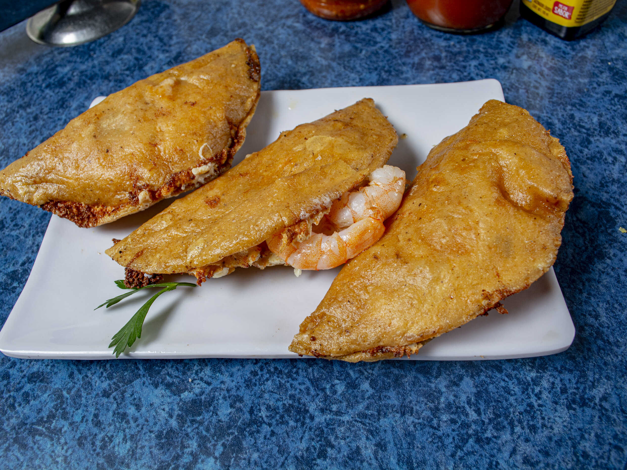 Deliciosa quesadilla frita de camarón en tortilla normal con queso oaxaca gratinado
