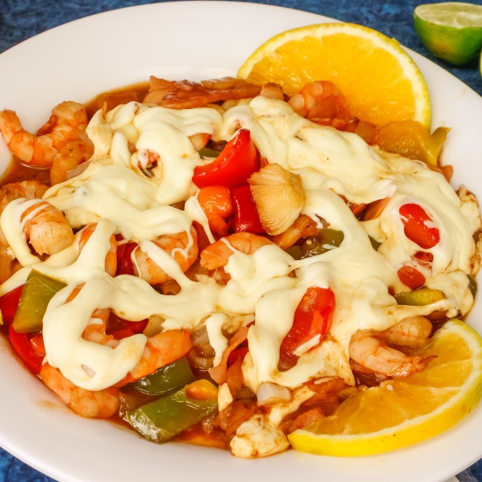 Exquisito alambre de camaron cocinado con cebolla, tocino, pimiento morrón y queso oaxaca gratinado acompañado de tortillas de harina.