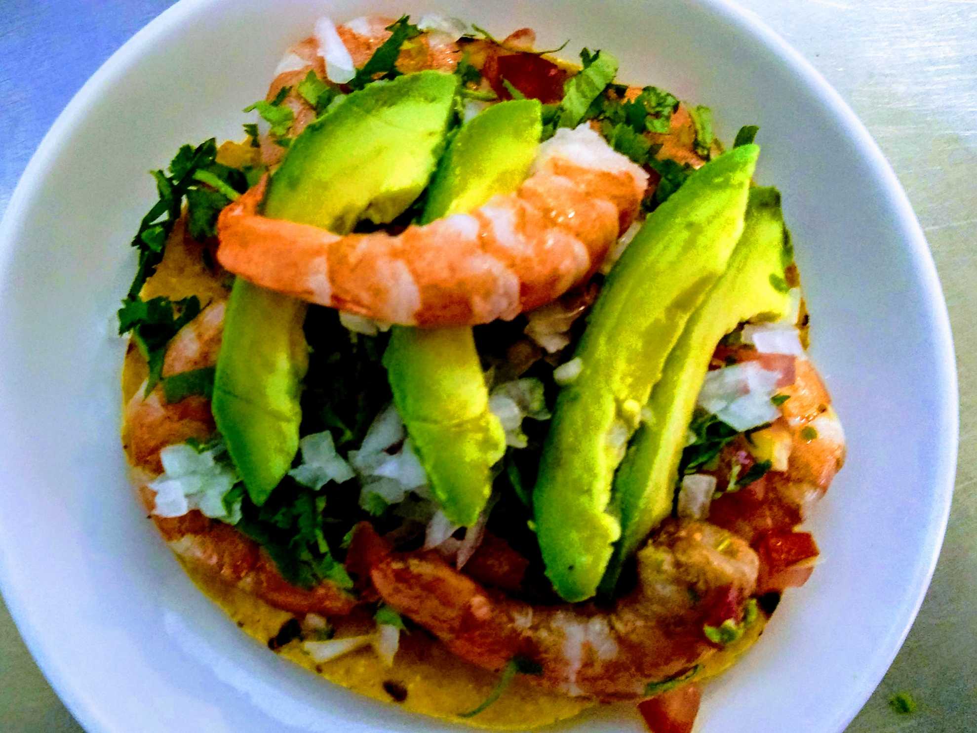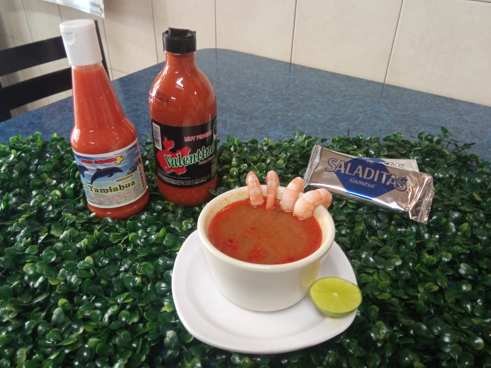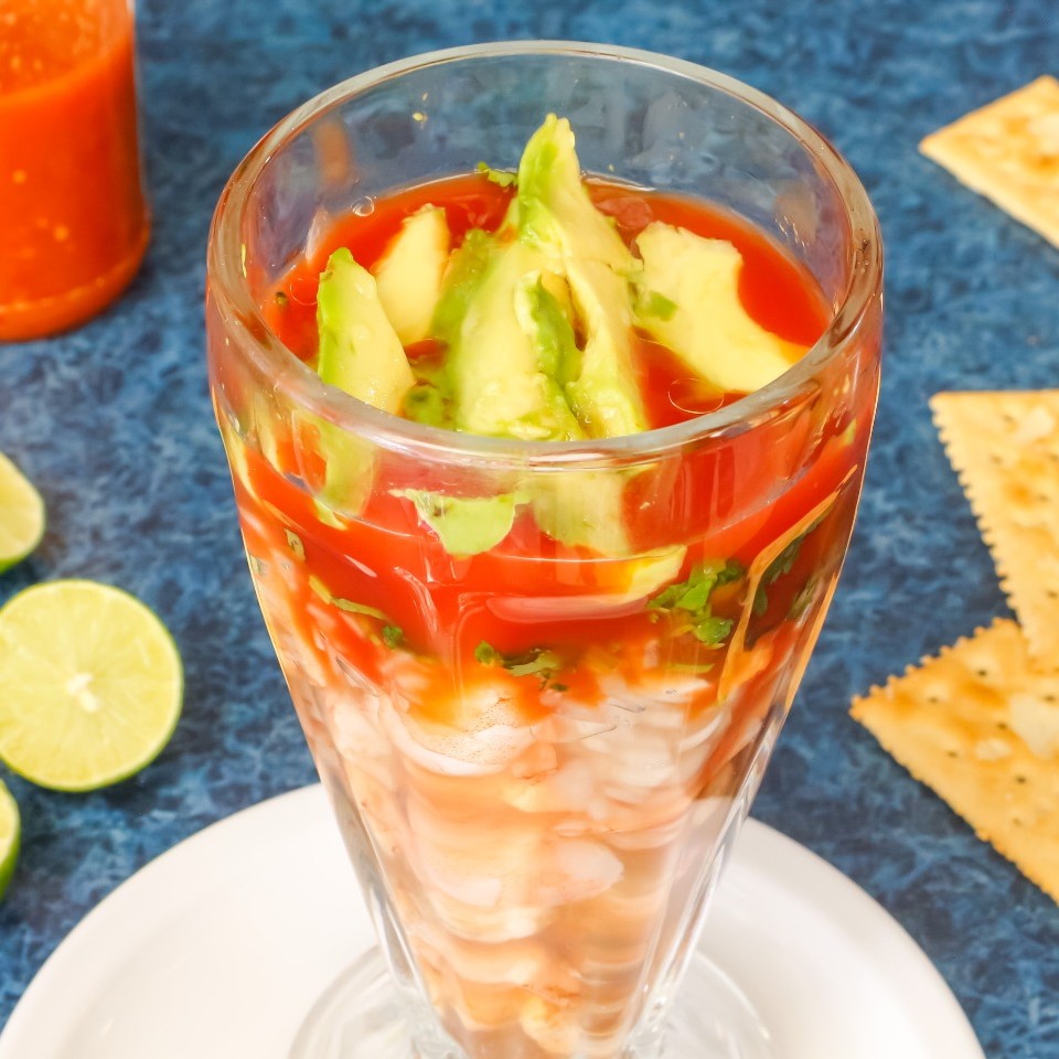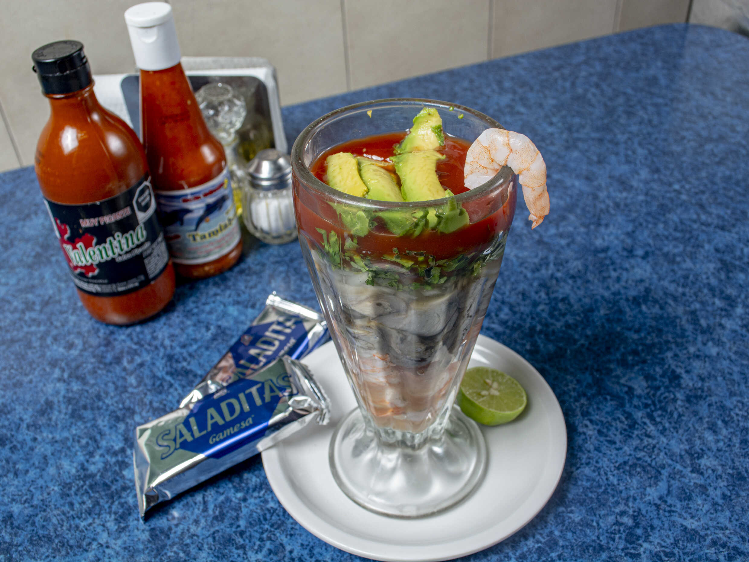 Camaron con pulpo, catsup cebolla,cilantro y aguacate