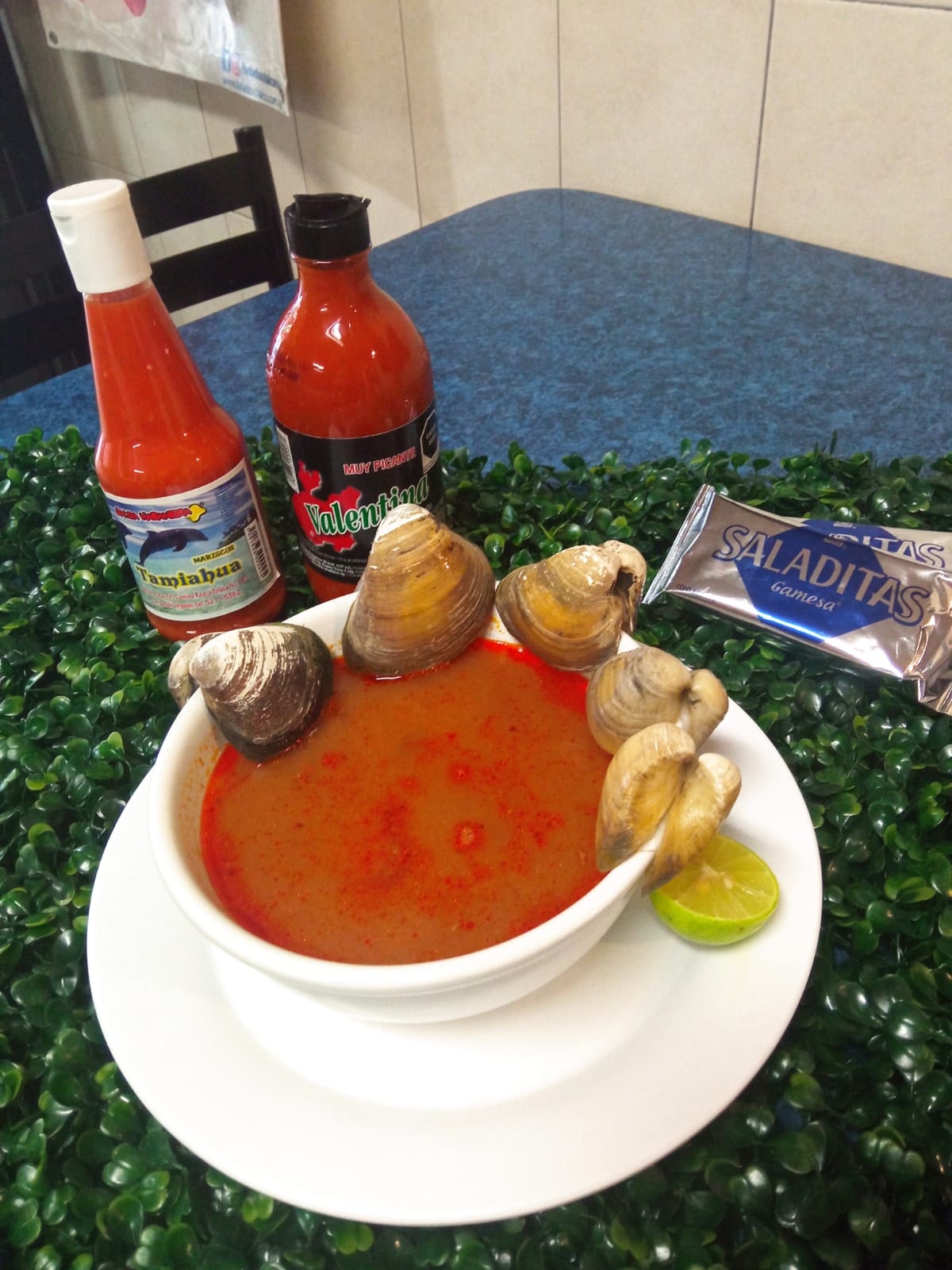 Caldo con rebanada de peto, un trozo de cabeza y 3 almejas.