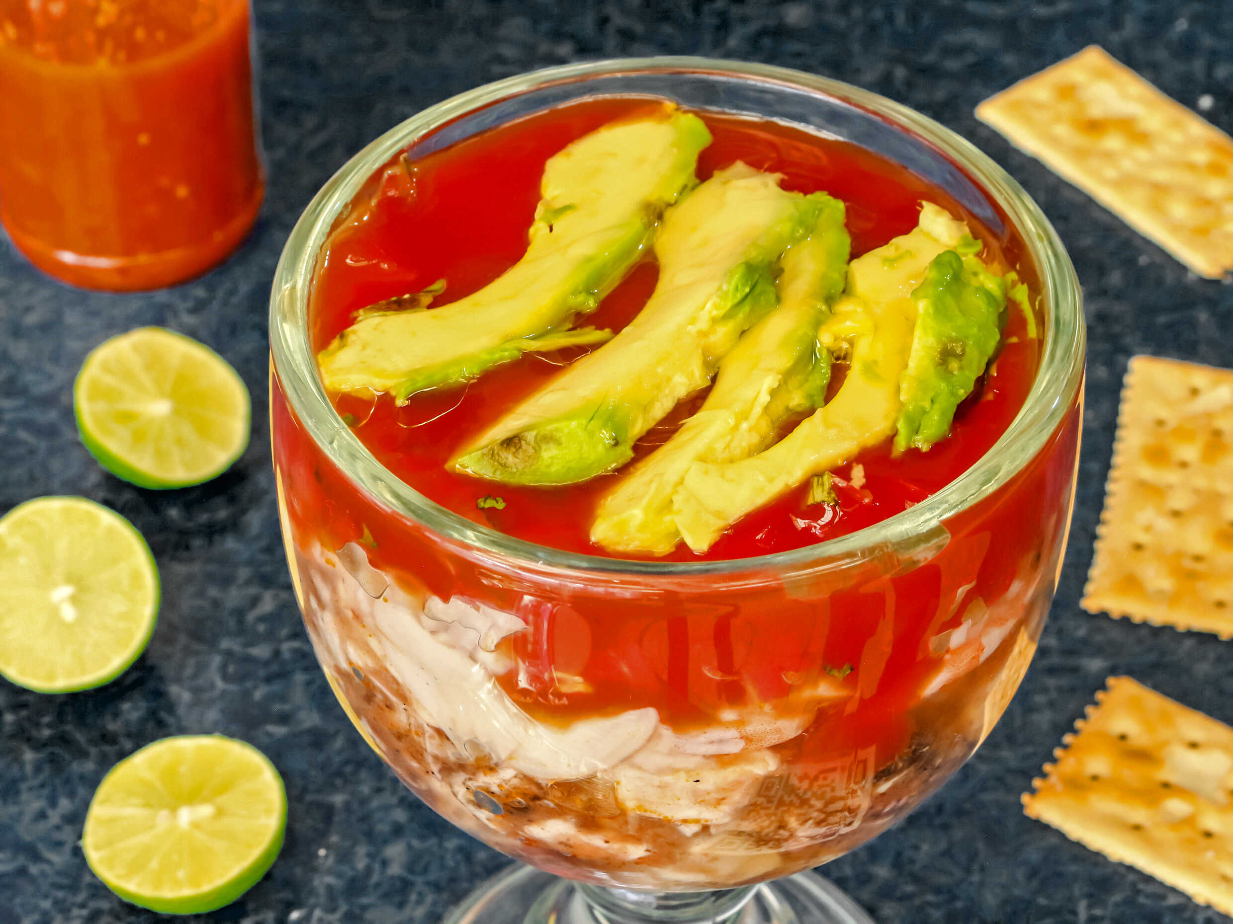 Cóctel preparado con cebolla, cilantro, cátsup y aguacate.