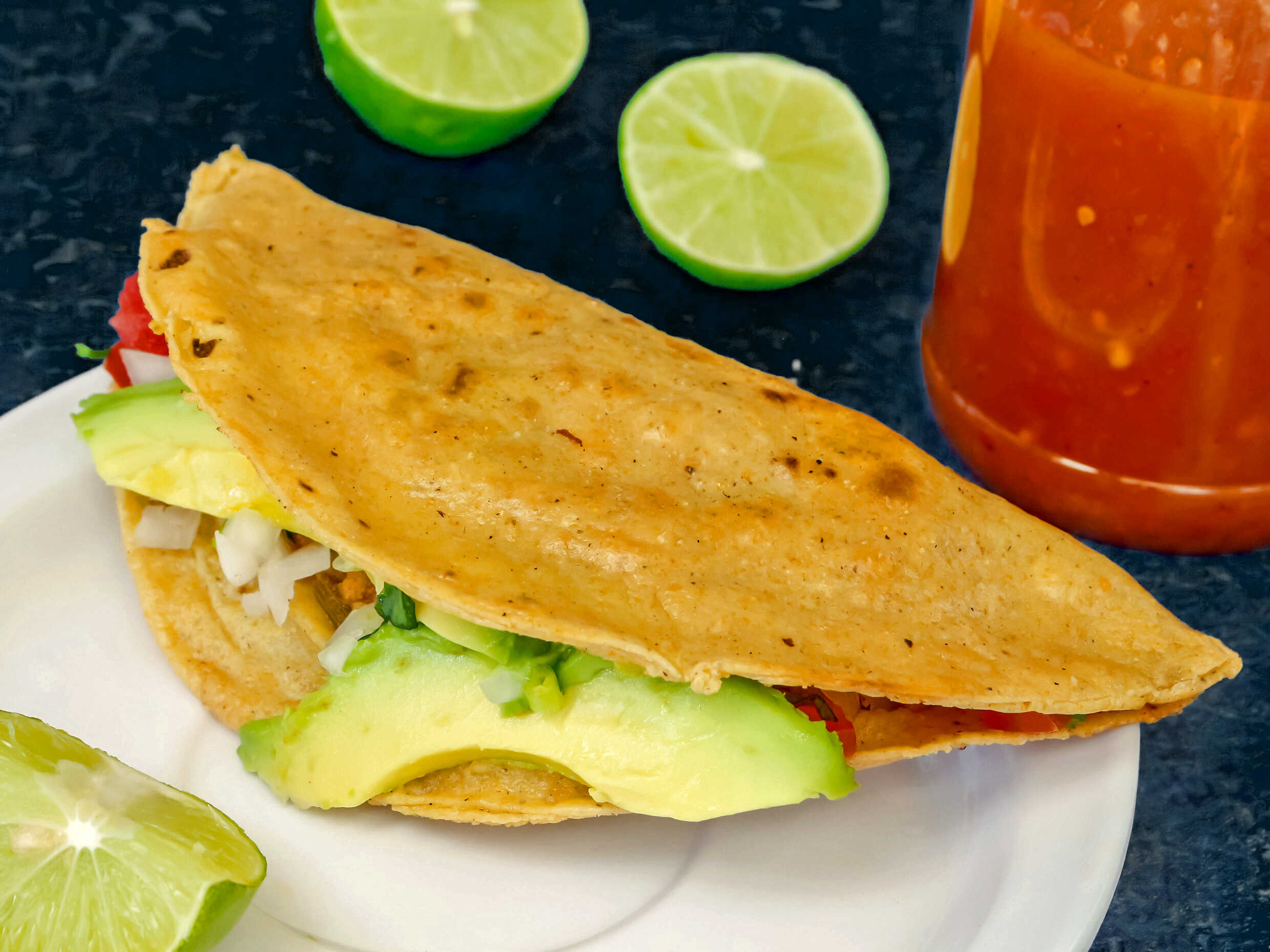 Tradicional quesadilla en tortilla normal preparada con pico de gallo y aguacate