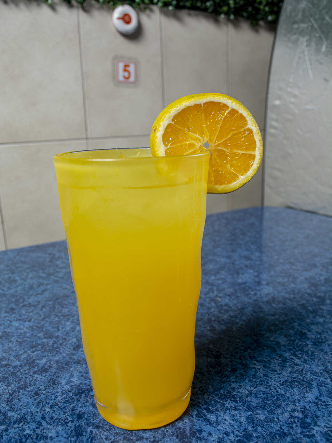 Agua mineral de 750 ml. con jugo de naranja y jarabe.