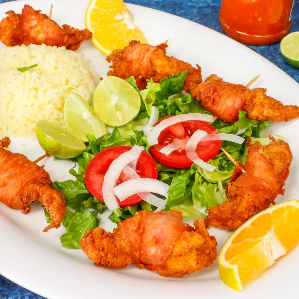 Ricos camarones empanizados rellenos de queso oaxaca enrollados con tocino
