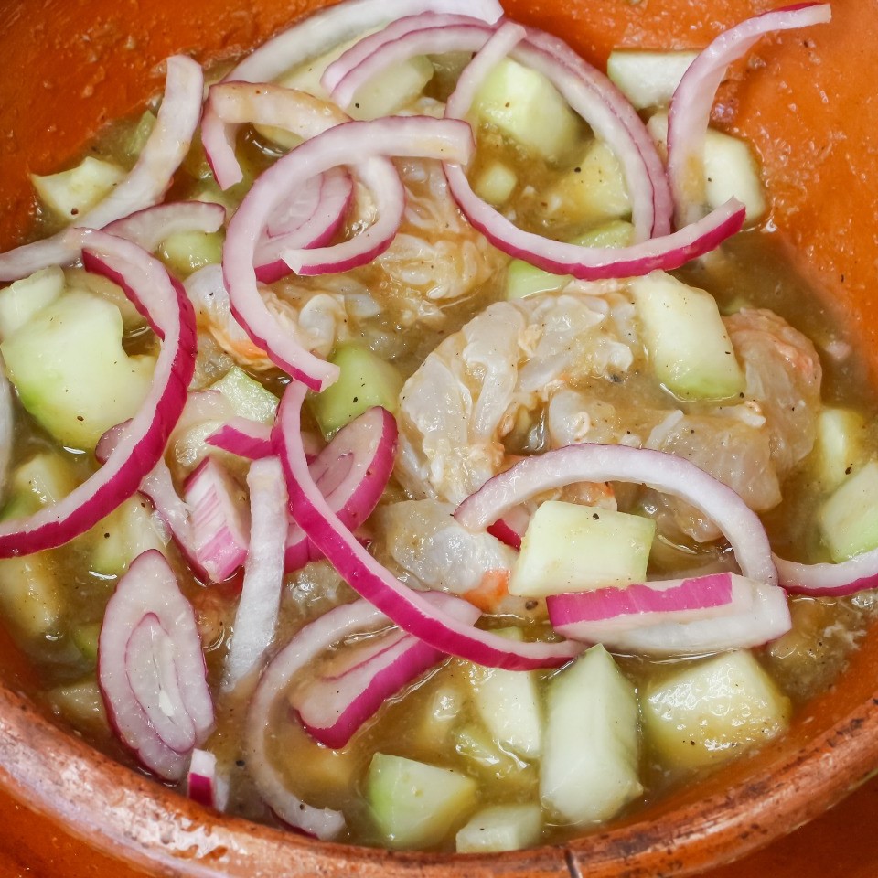 Exquisitos camarones cocidos al limón con chile serrano acompañados de pepinos y cebolla morada.