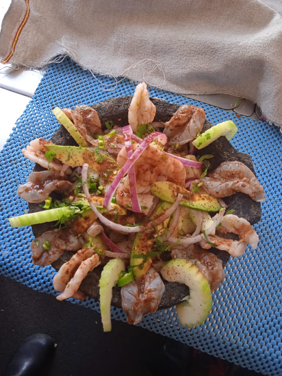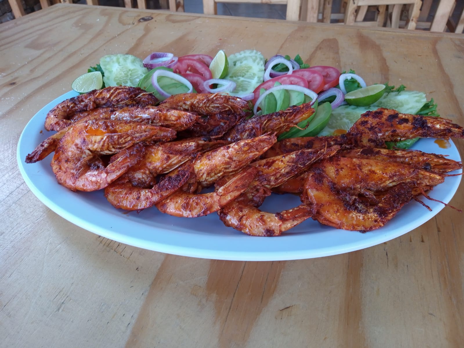Camaron mariposeado, pepino cebolla y chile